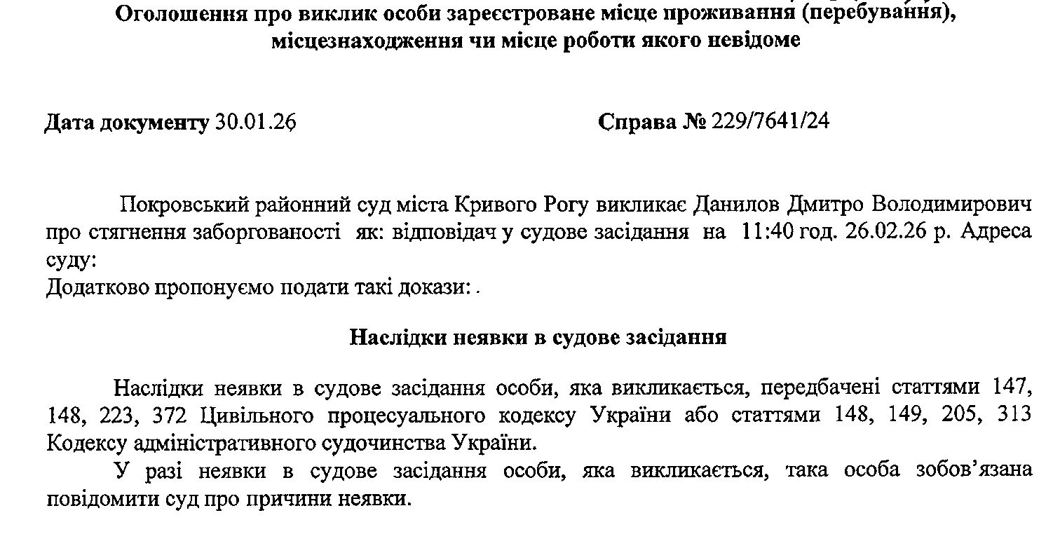 Оголошення про виклик до суду Данилова Дмитра Володимировича