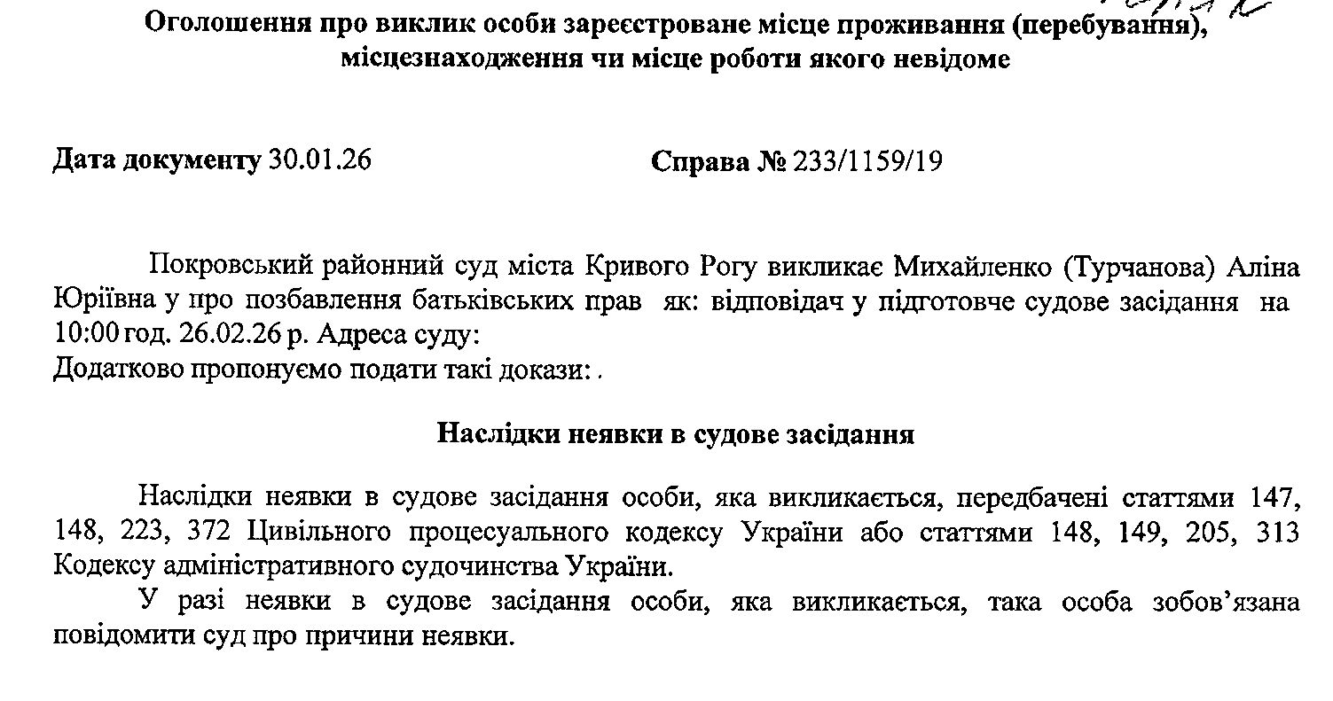 Оголошення про виклик до суду Михайленко (Турчанової) Аліни Юріївни