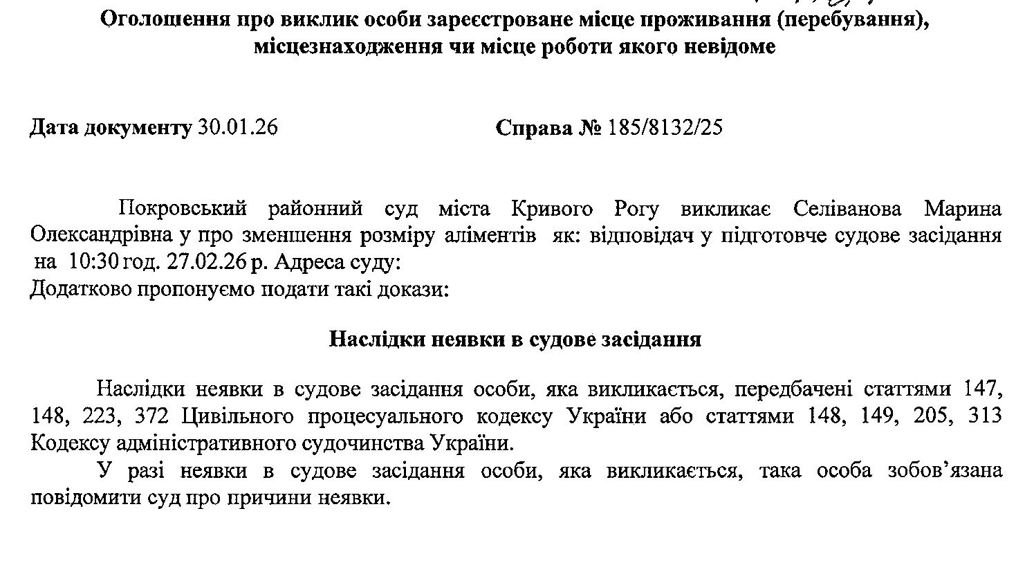Оголошення про виклик до суду Селіванової Марини Олександрівни