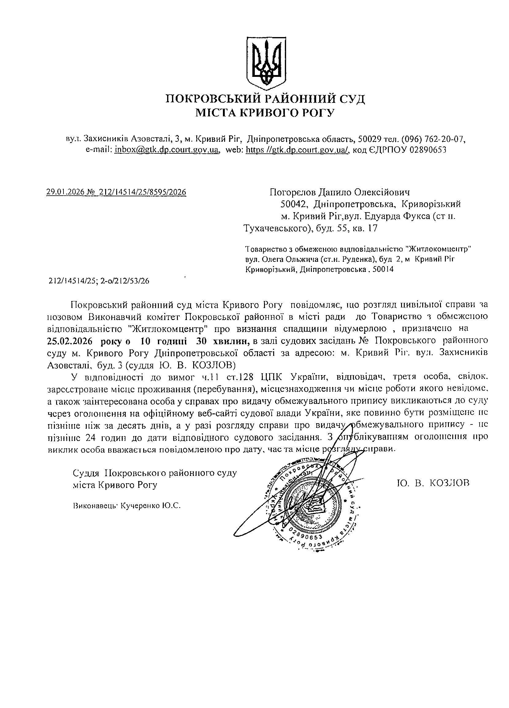 Оголошення про виклик до суду Погорєлова Данила Олексійовича
