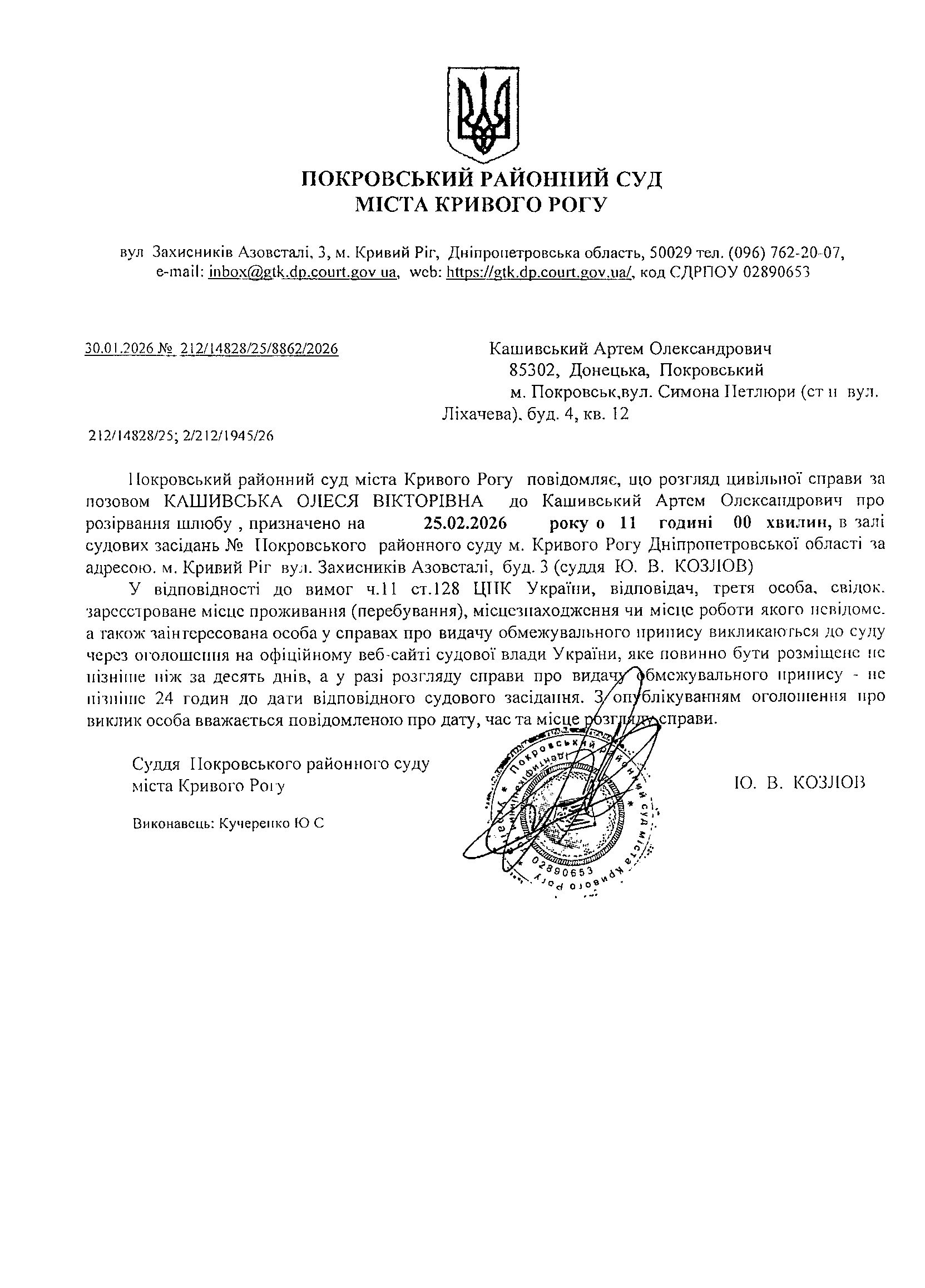 Оголошення про виклик до суду Кашивського Артема Олександровича