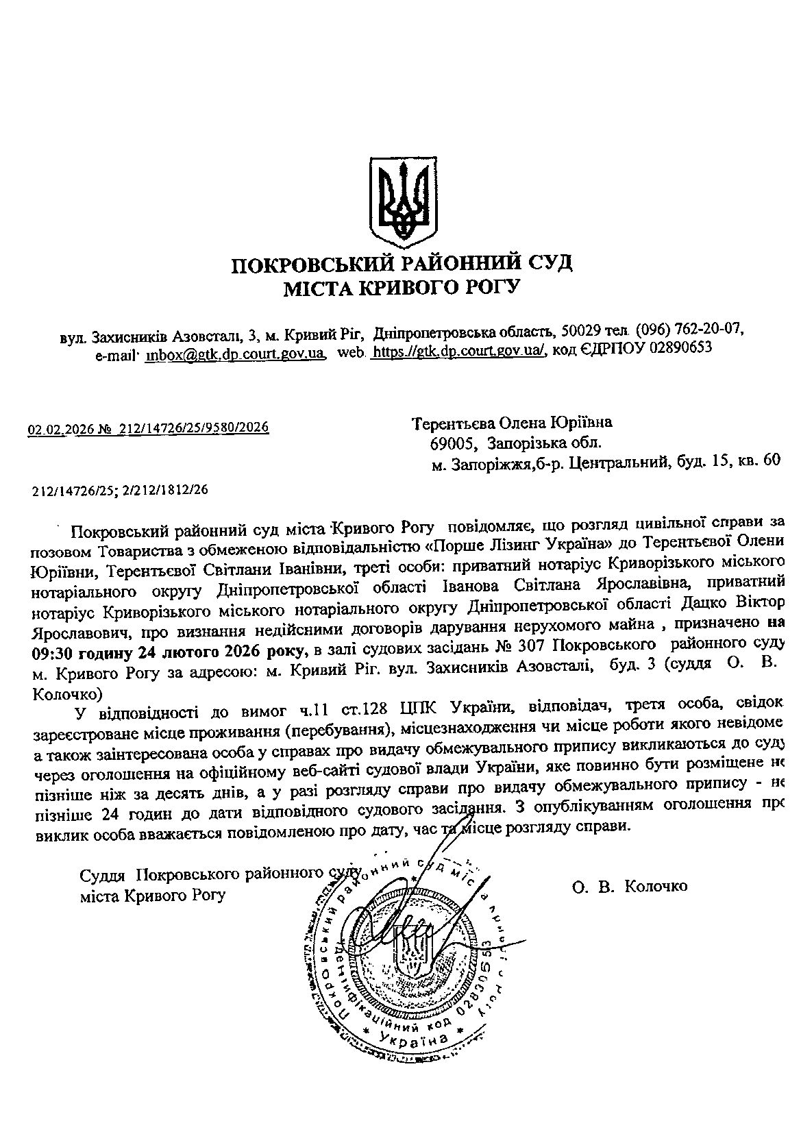 Оголошення про виклик до суду Терентьєвої Олени Юріївни
