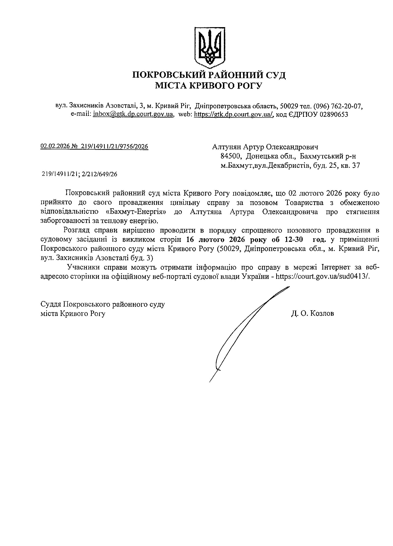 Оголошення про виклик до суду Алтуняна Артура Олексндровича