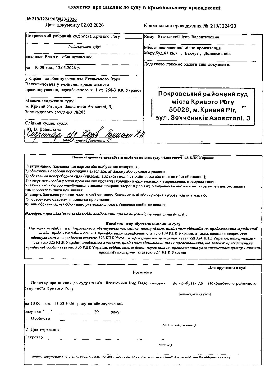 Оголошення про виклик до суду Ягельського Ігора Валентиновича