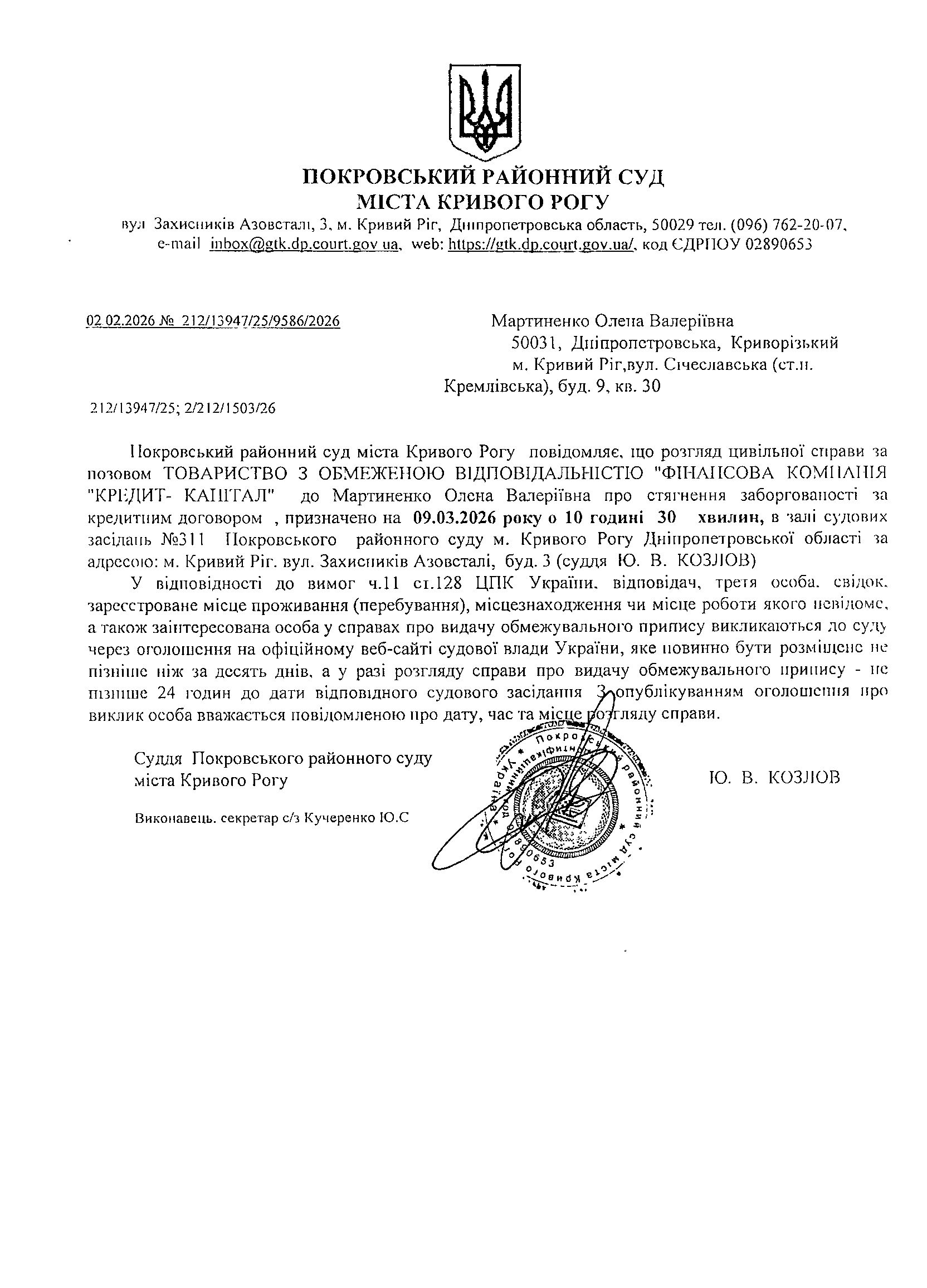 Оголошення про виклик до суду Мартиненко Олени Валеріївни