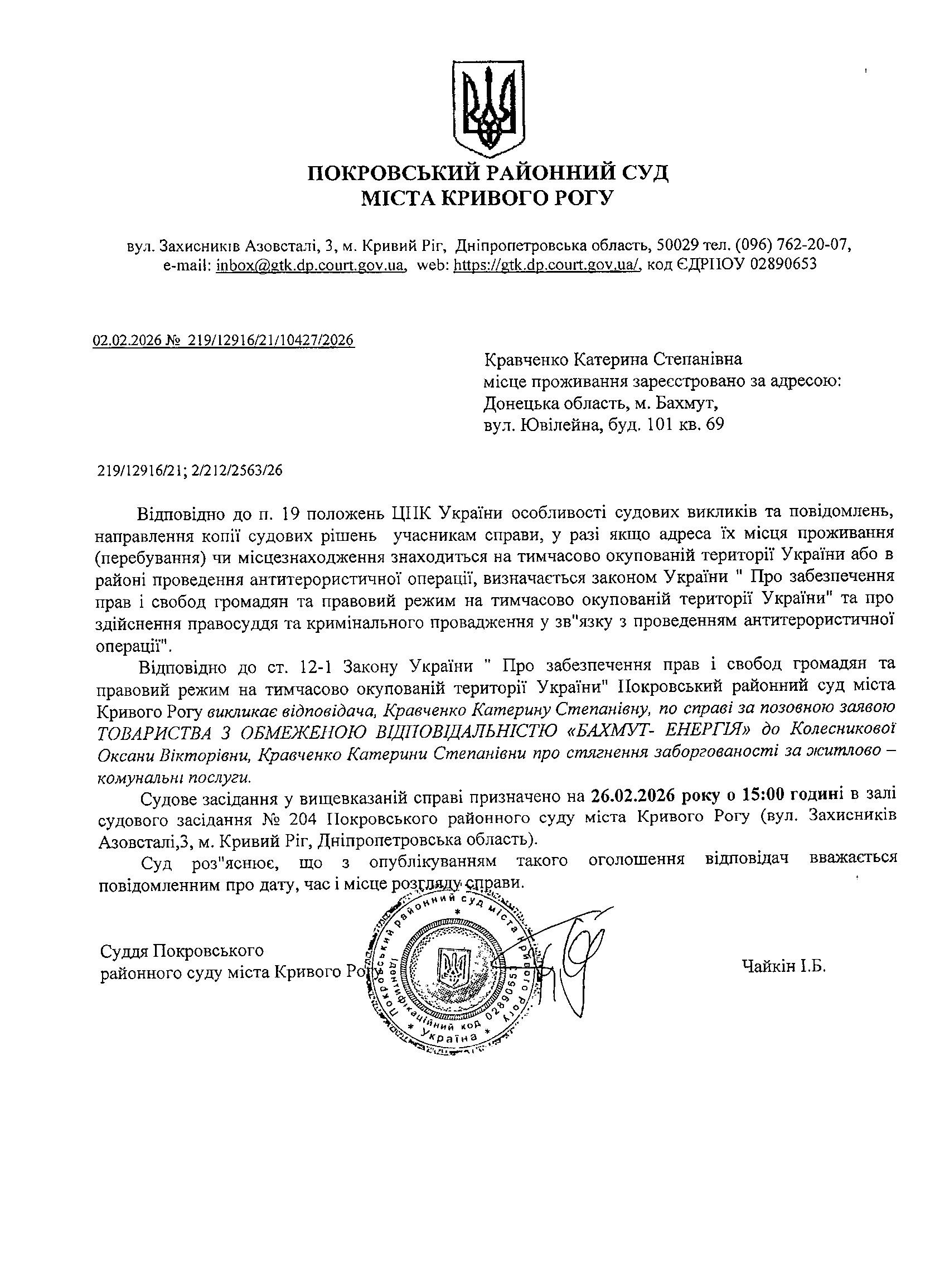 Оголошення про виклик до суду Кравченко Катерини Степанівни