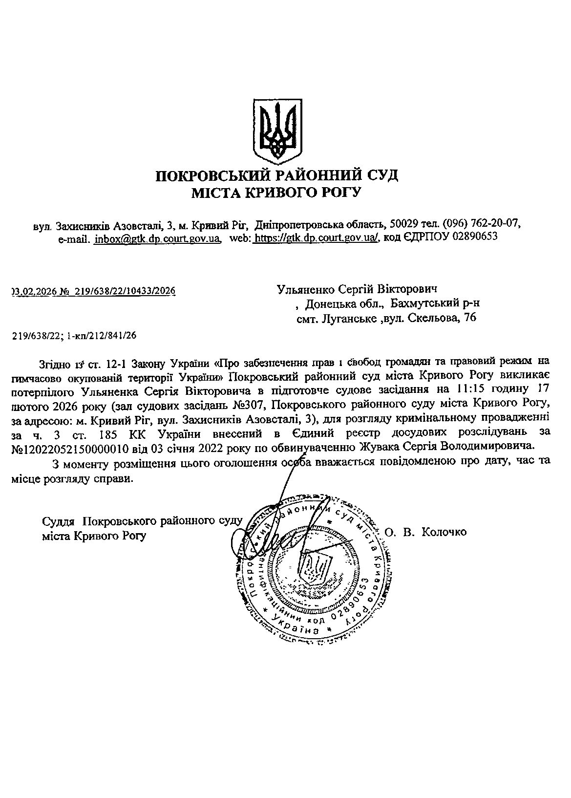 Оголошення про виклик до суду Ульяненка Сергія Вікторовича