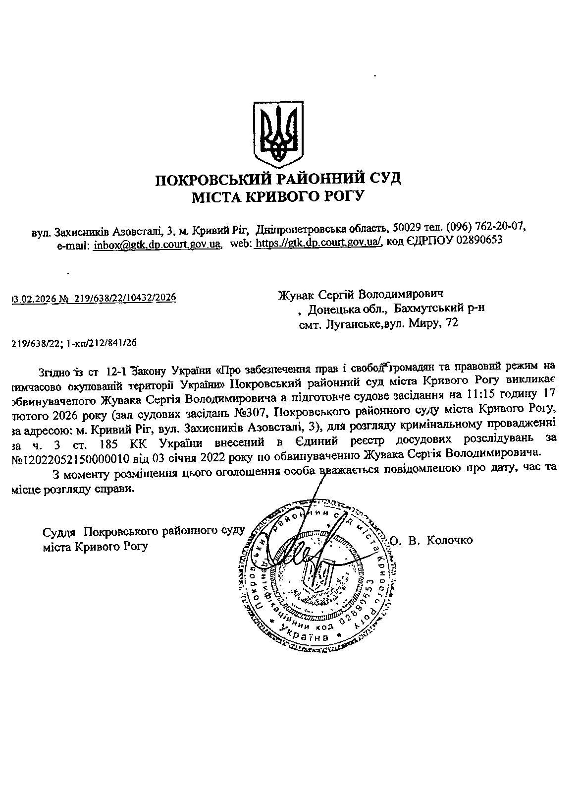 Оголошення про виклик до суду Жувака Сергія Володимировича