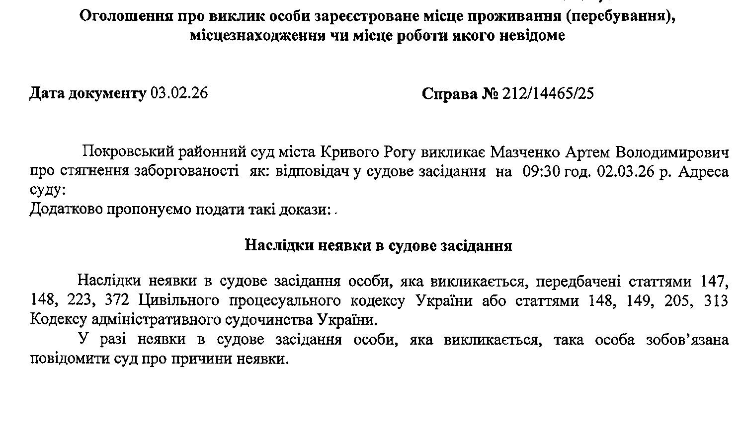 Оголошення про виклик до суду Мазченка Артема Володимировича
