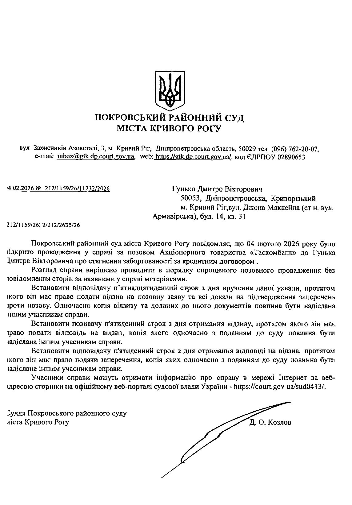 Оголошення про виклик до суду Гунька Дмитра Вікторовича