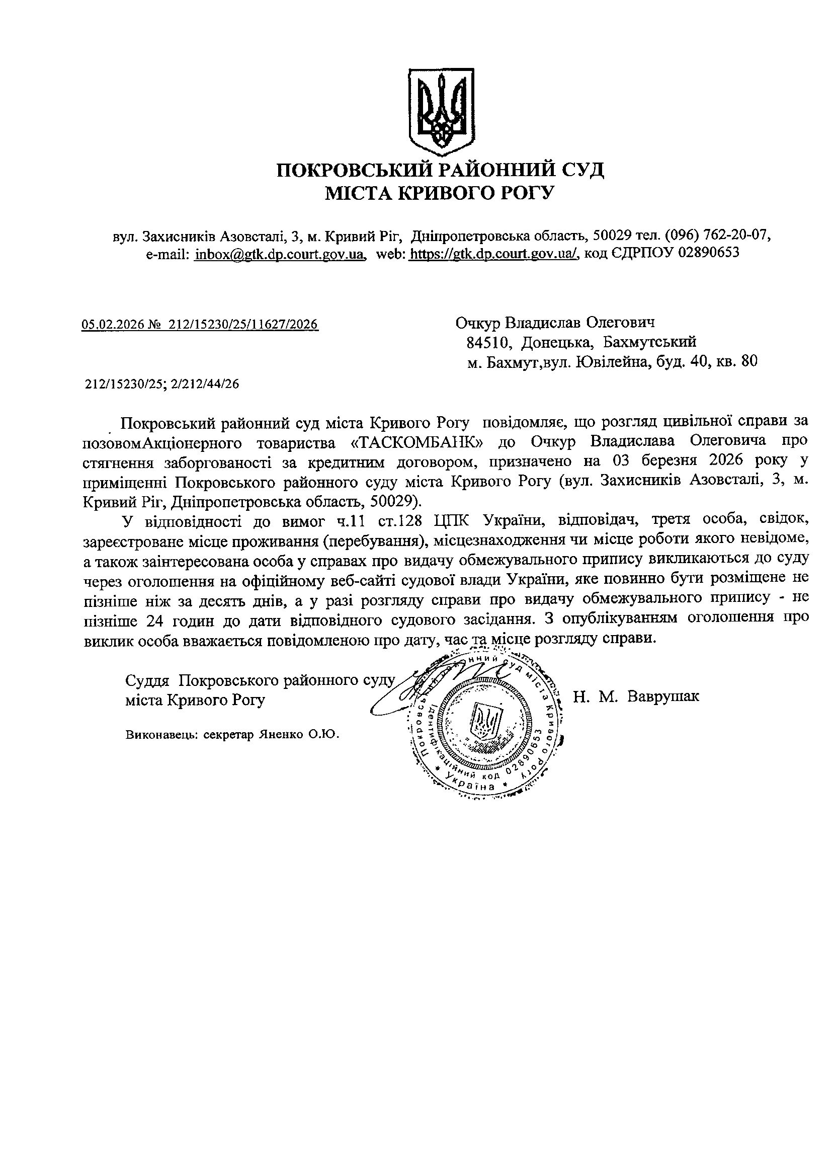 Оголошення про виклик до суду Очкура Владислава Олеговича