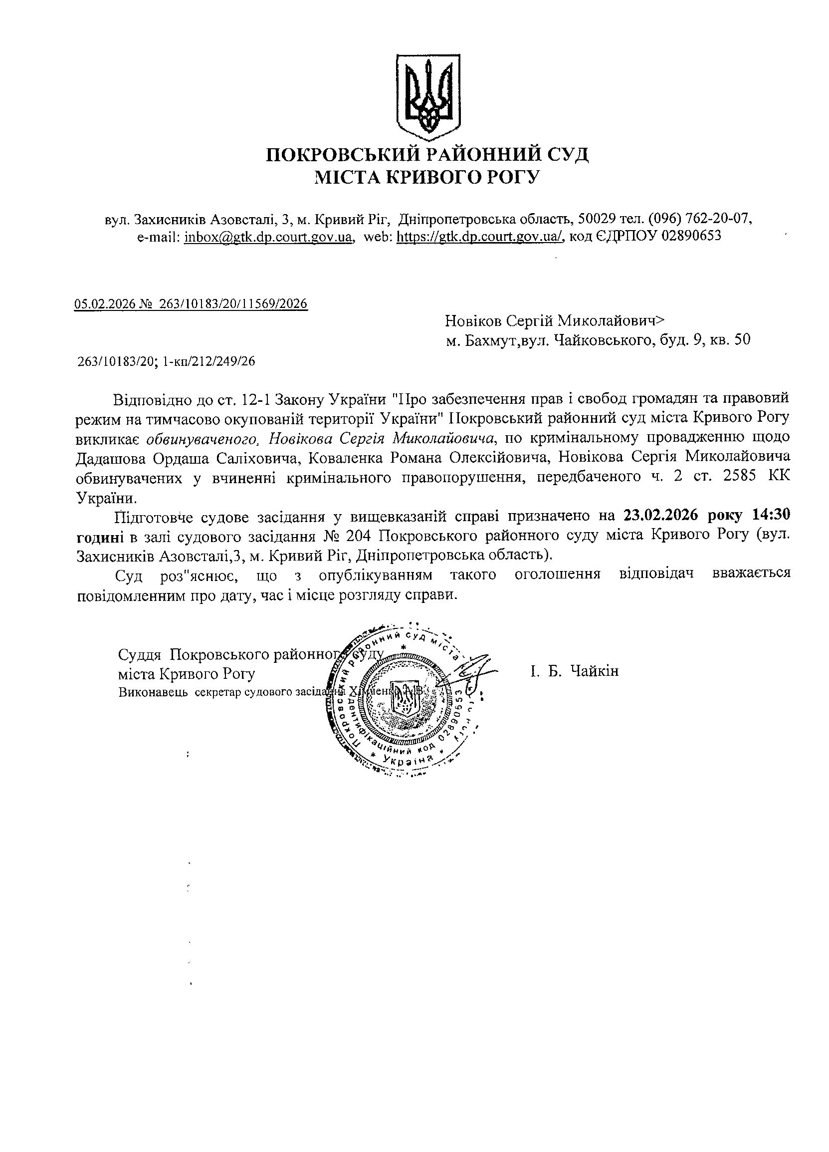 Оголошення про виклик до суду Новікова Сергія Миколайовича