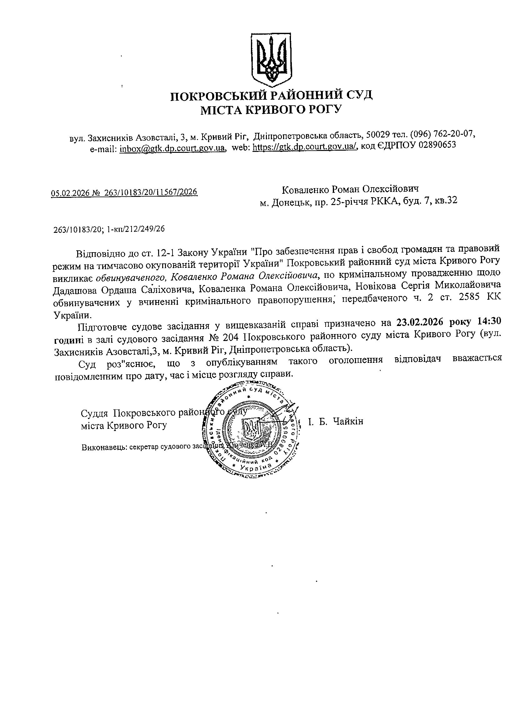 Оголошення про виклик до суду Коваленка Романа Олексійовича
