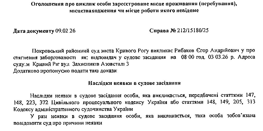 Оголошення про виклик до суду Рибакова Єгора Андрійовича