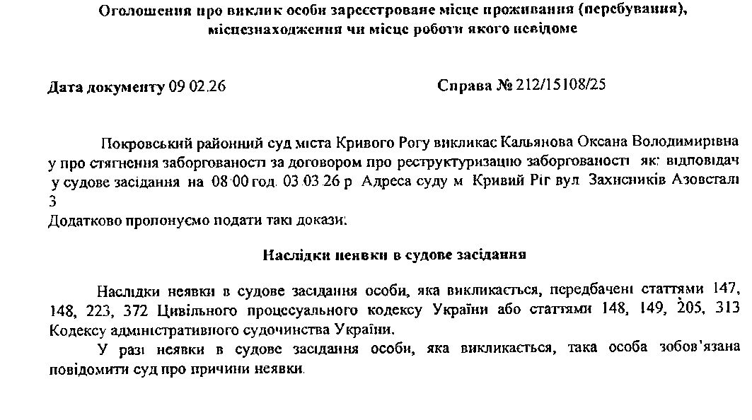 Оголошення про виклик до суду Кальянової Оксани Володимирівни