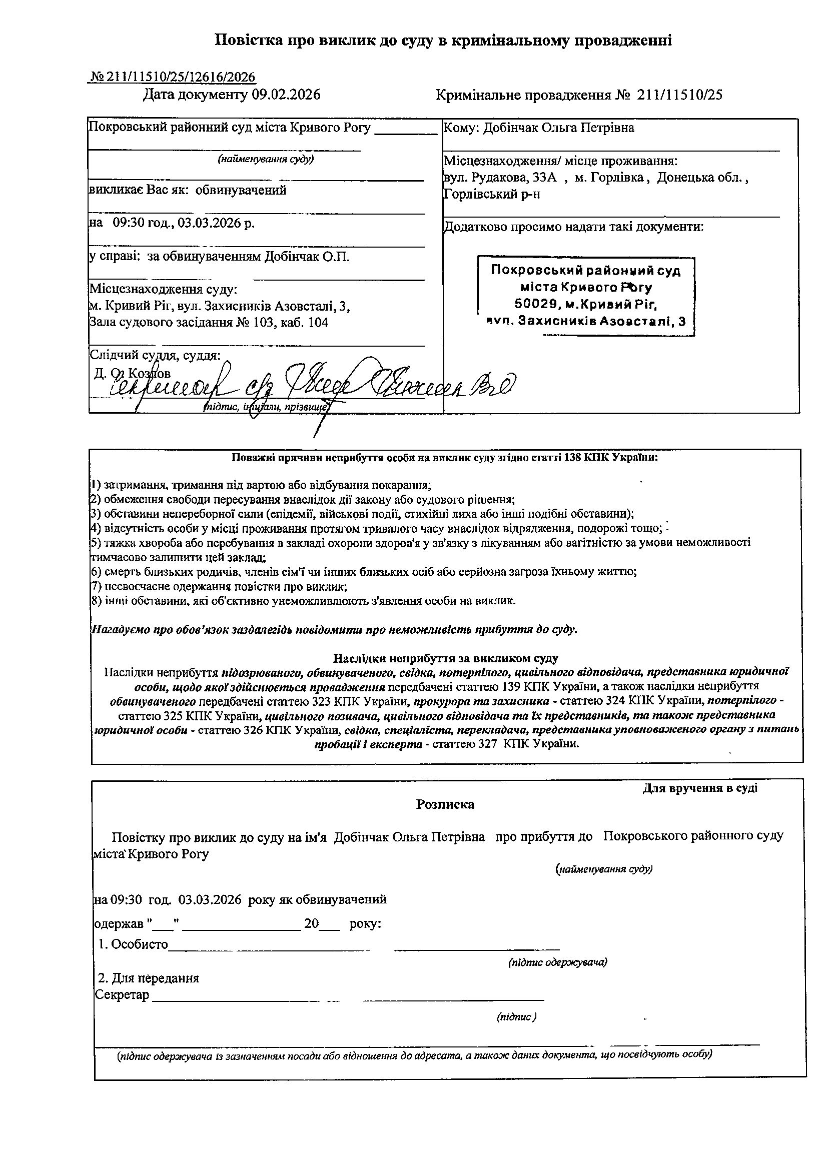 Оголошення про виклик до суду Добінчак Ольги Петрівни