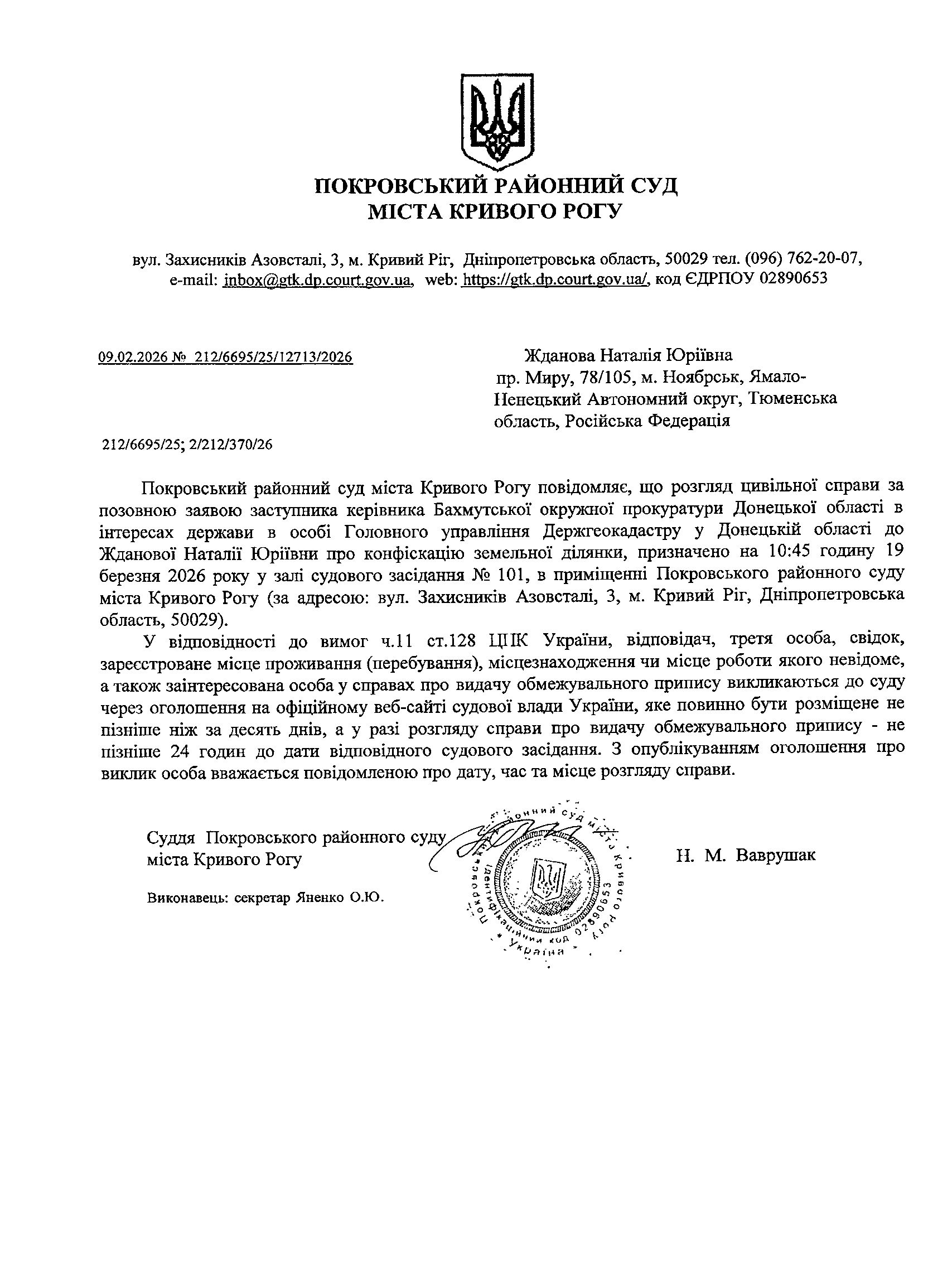 Оголошення про виклик до суду Жданової Наталії Юріївни