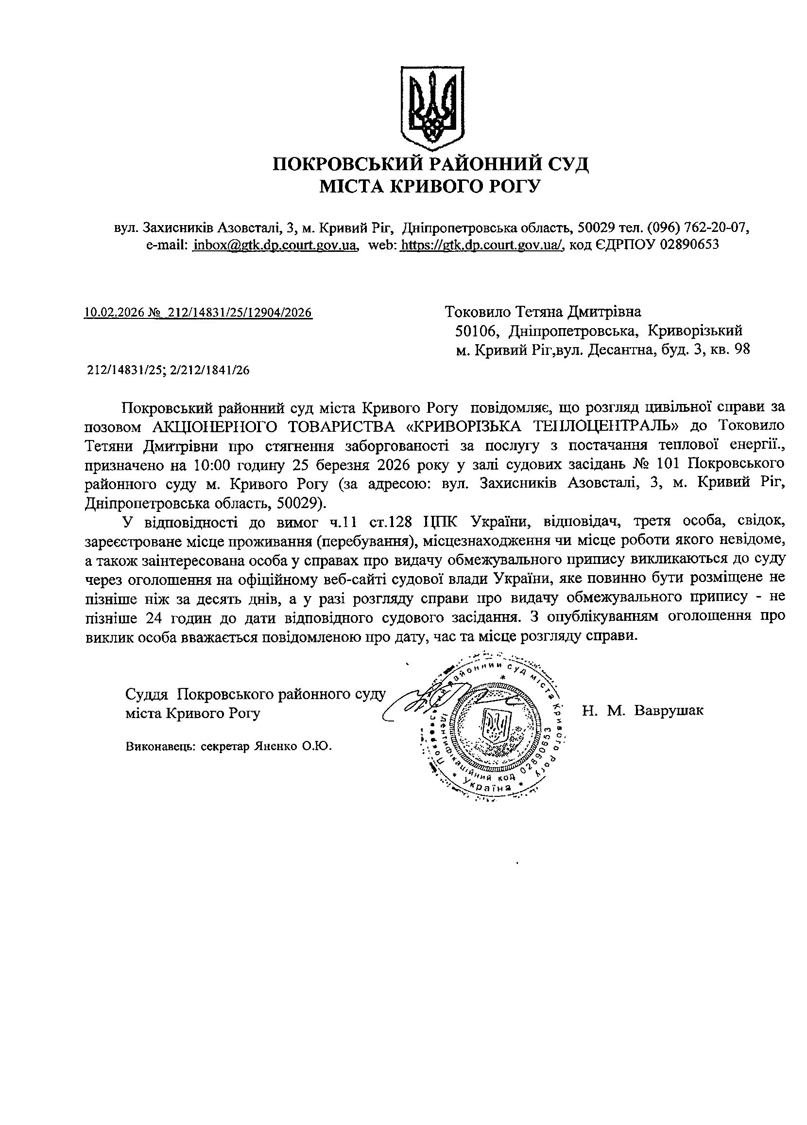 Оголошення про виклик до суду Токовило Тетяну Дмитрівну