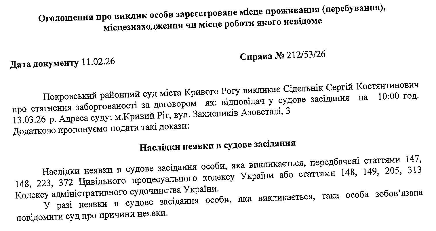 Оголошення про виклик до суду Сідєльніка Сергія Костянтиновича