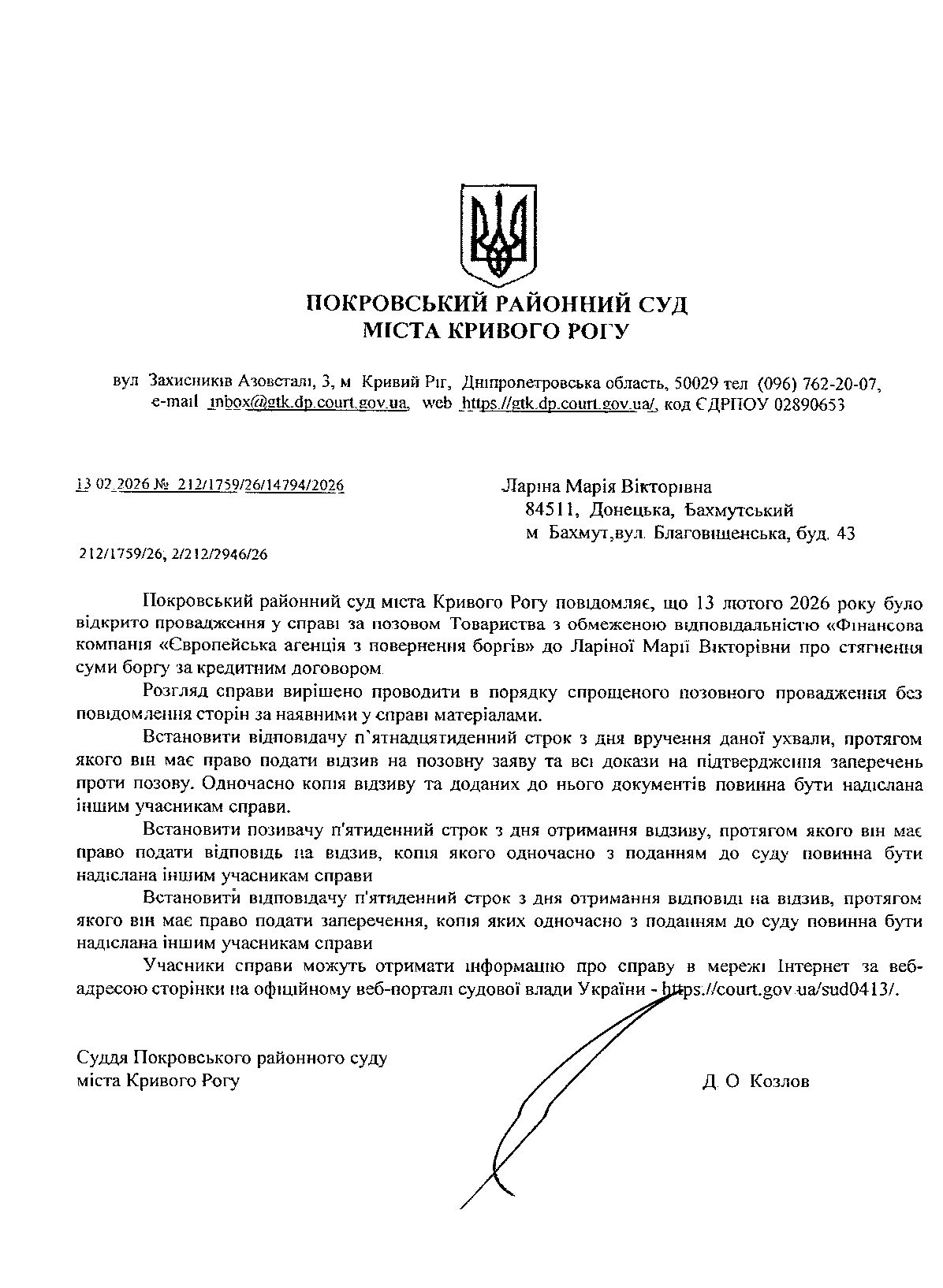Оголошення про виклик до суду Ларіної Марії Вікторівни