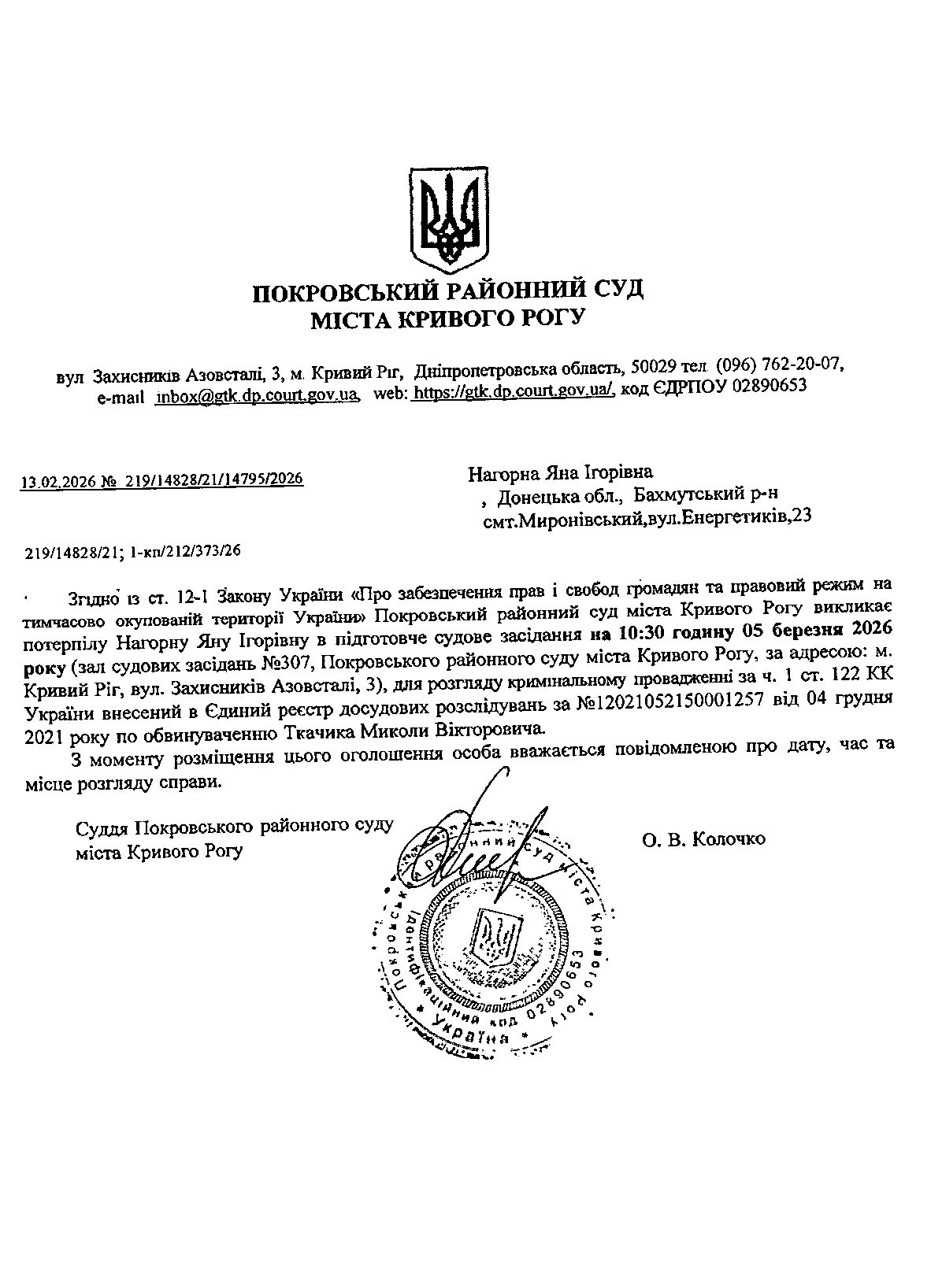 Оголошення про виклик до суду Нагорної Яни Ігорівни