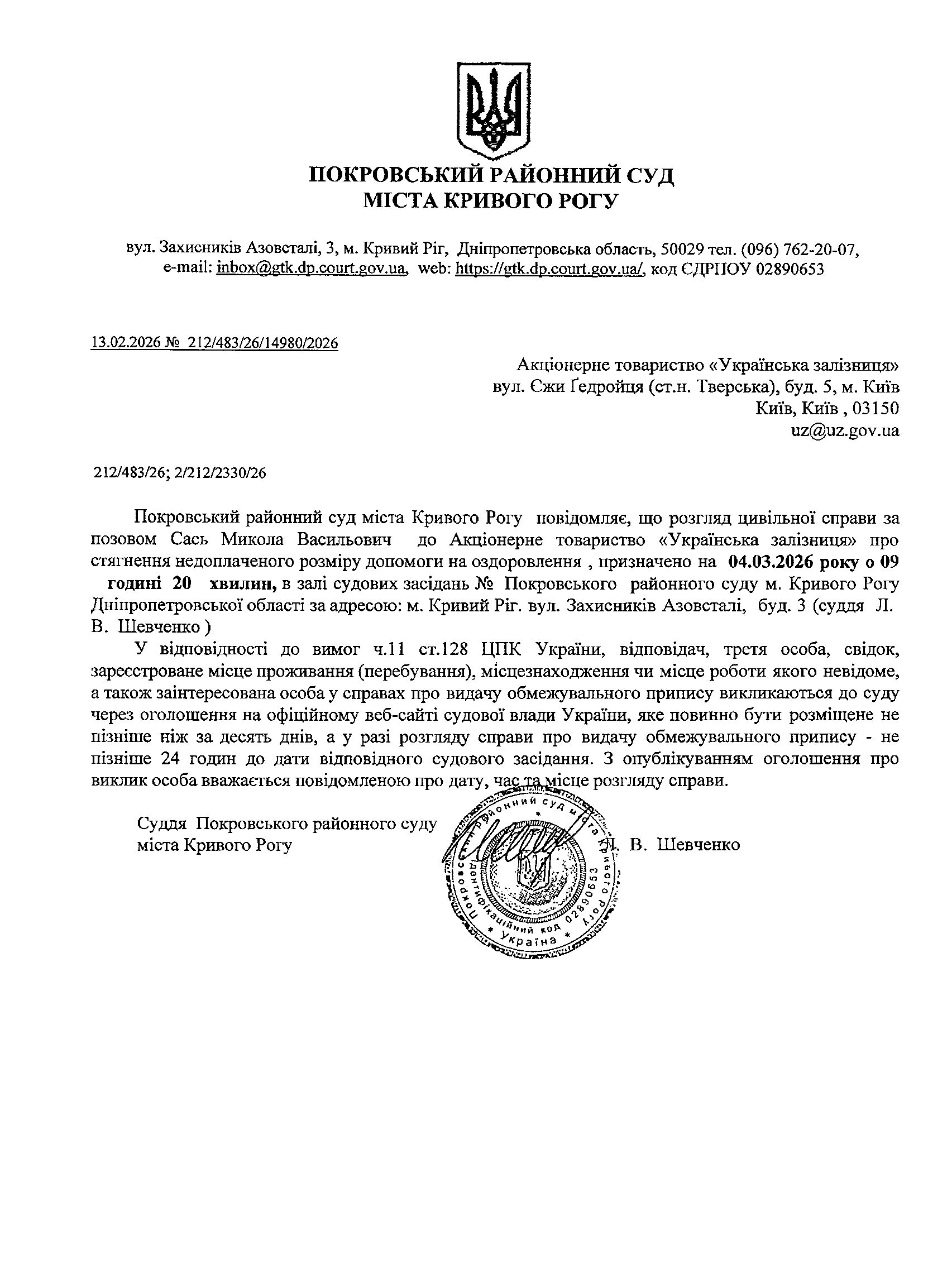 Оголошення про виклик до суду АТ "Українська залізниця"