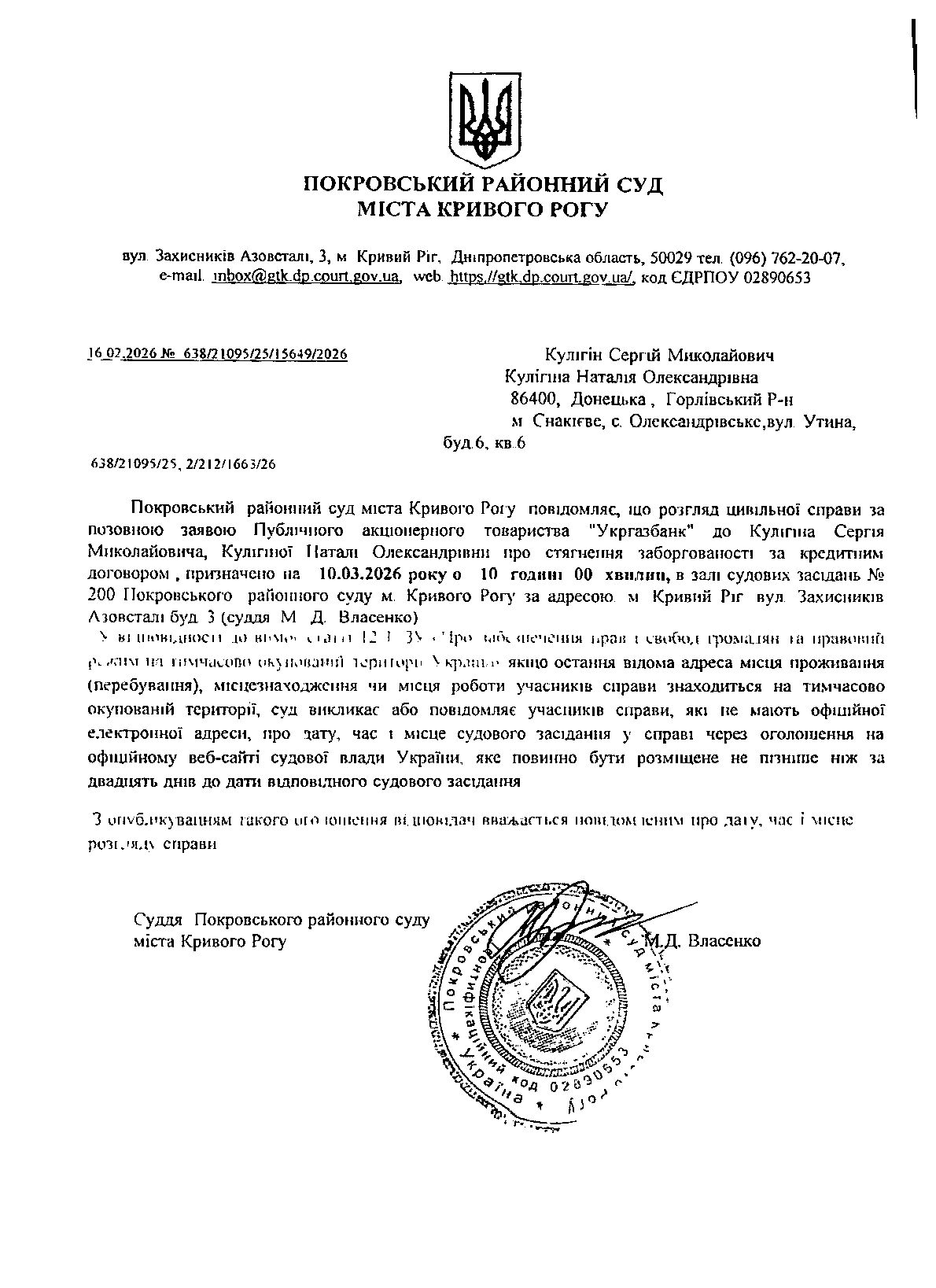 Оголошення про виклик до суду Кулигіна Сергія Миколайовича, Кулигіної Наталії Олександрівни