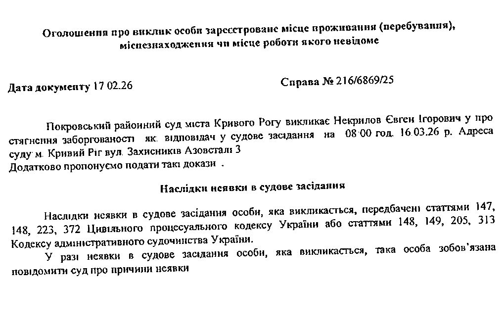 Оголошення про виклик до суду Некрилова Євгена Ігоровича