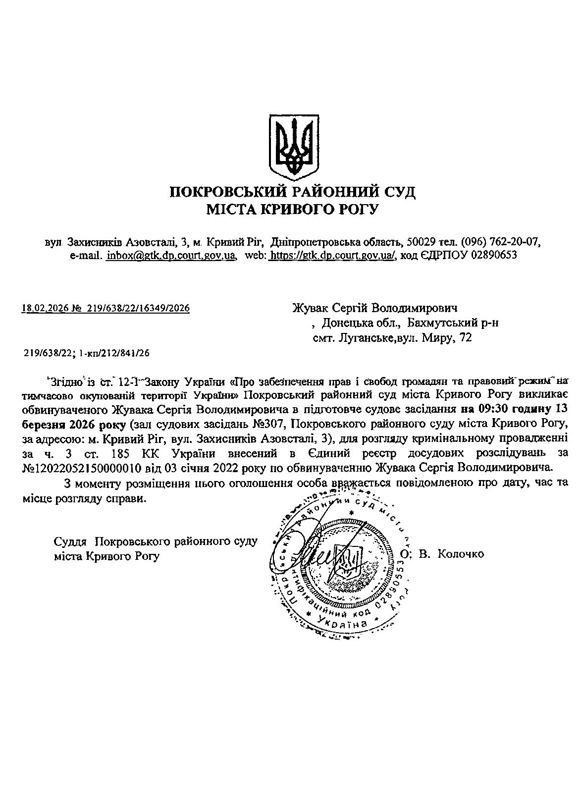 Оголошення про виклик до суду Жувака Сергія Володимировича