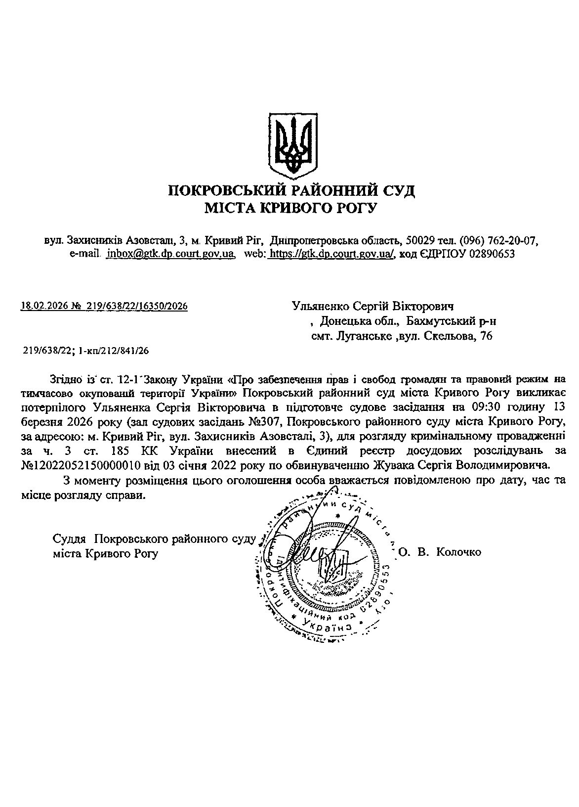 Оголошення про виклик до суду Ульяненка Сергія Вікторовича