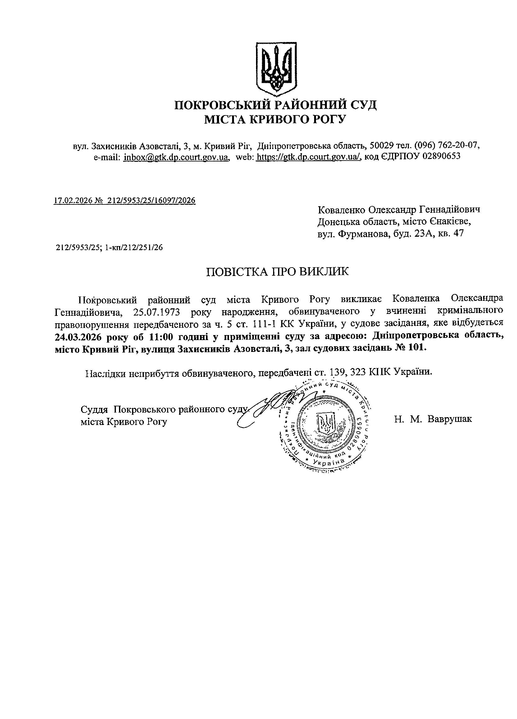 Оголошення про виклик до суду Коваленка Олександра Геннадійовича