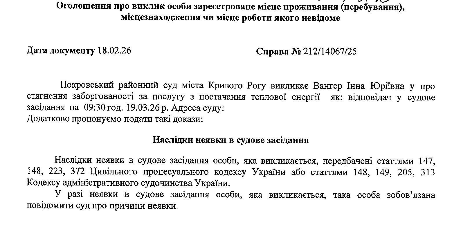 Оголошення про виклик до суду Вагнер Інни Юріївни