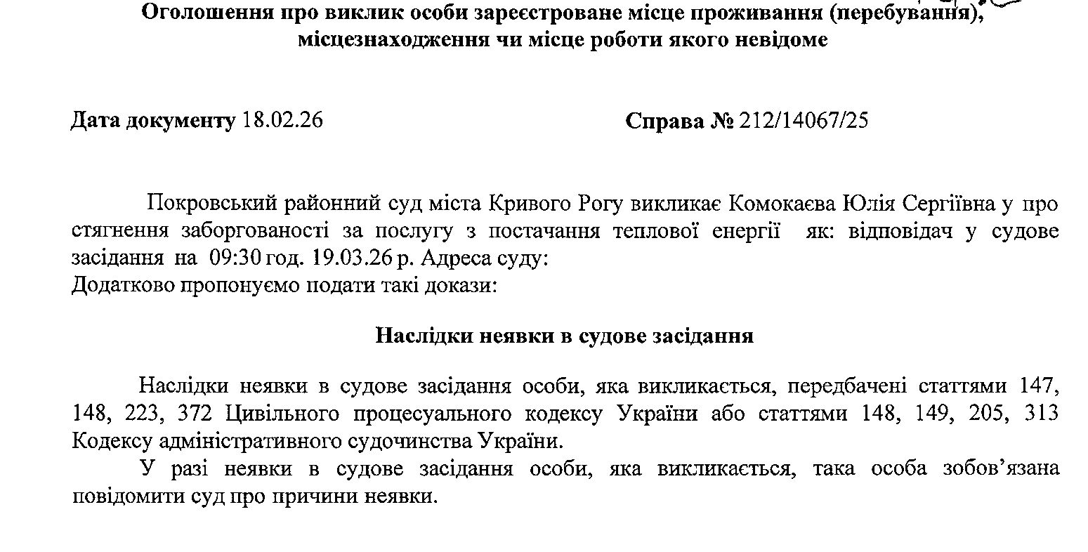 Оголошення про виклик до суду Комокаєвої Юлії Сергіївни