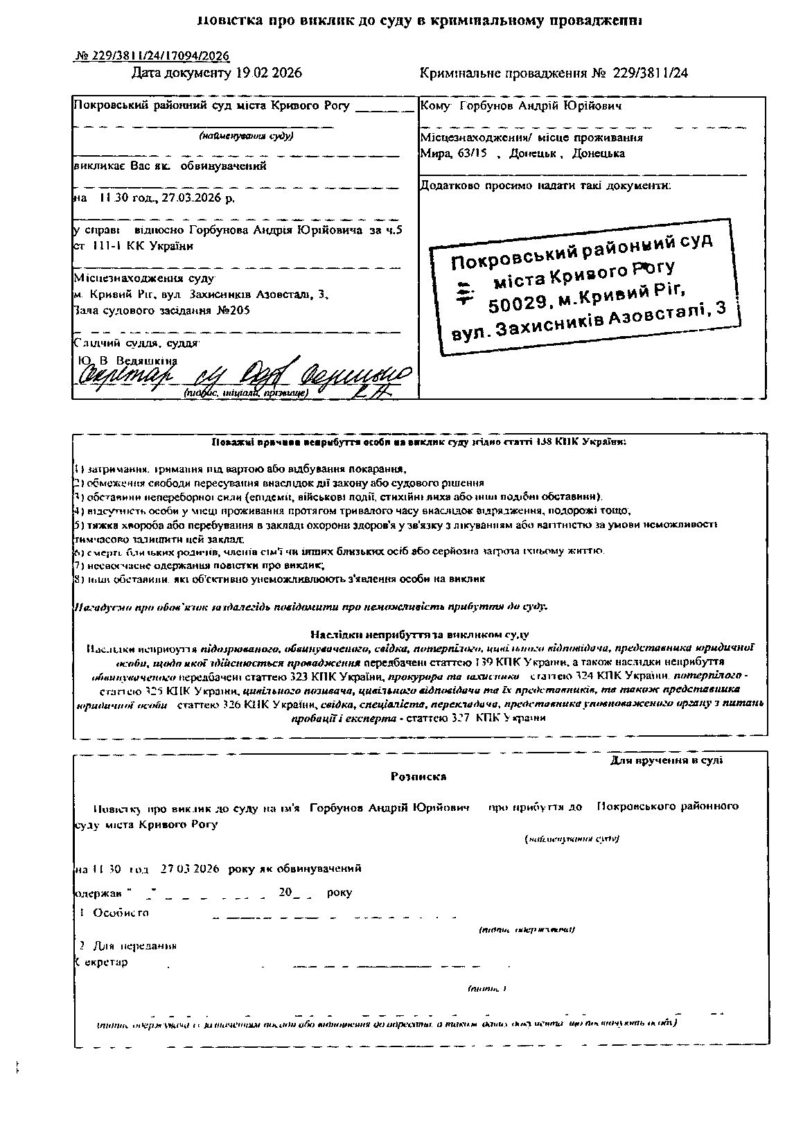 Оголошення про виклик до суду Горбунова Андрія Юрійовича
