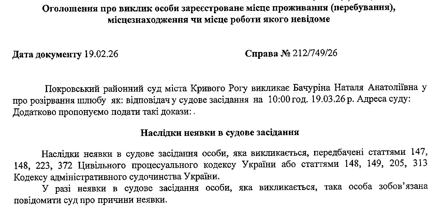Оголошення про виклик до суду Бачуріну Наталію Анатоліївну