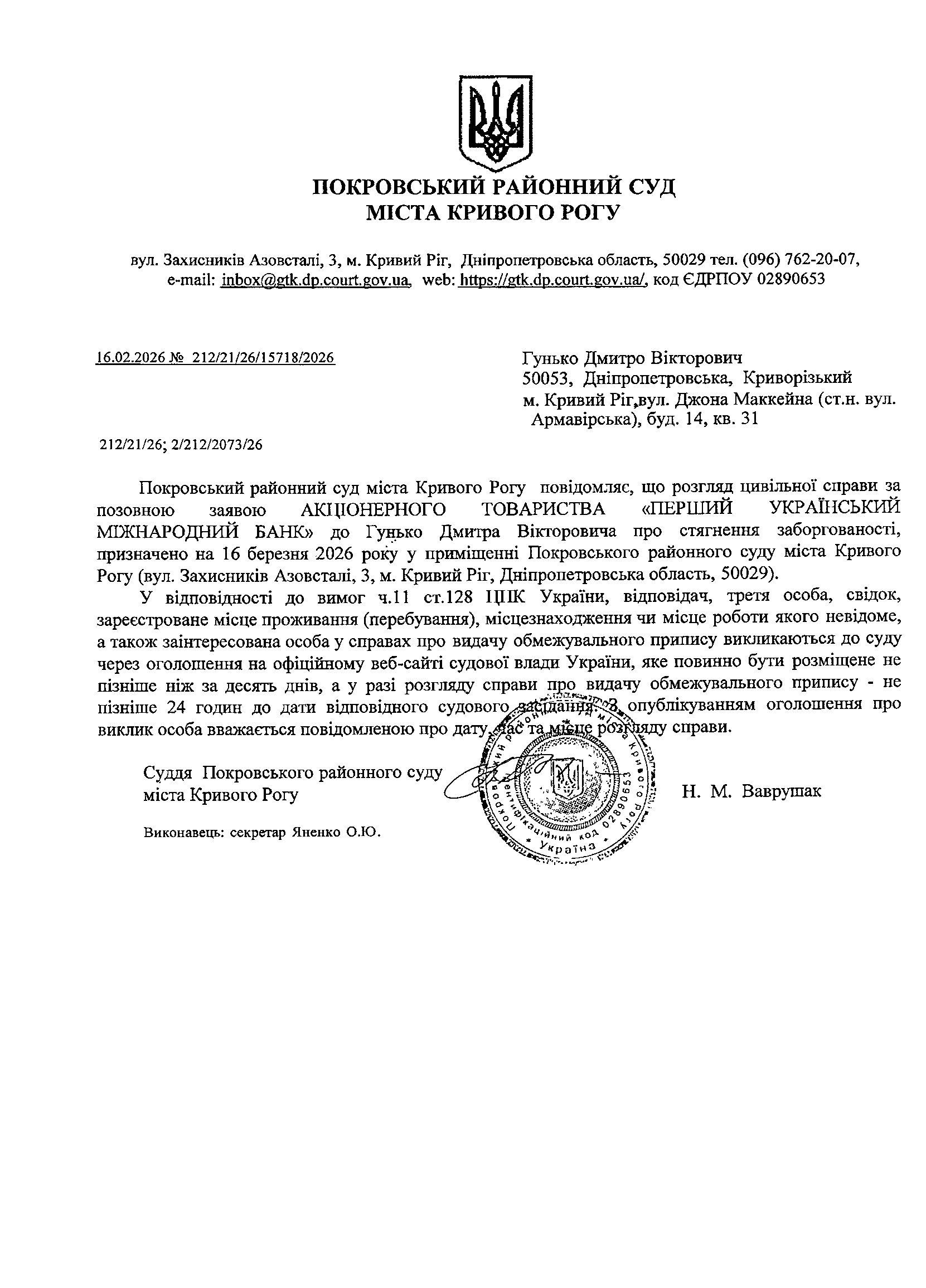 Оголошення про виклик до суду Гунька Дмитра Вікторовича
