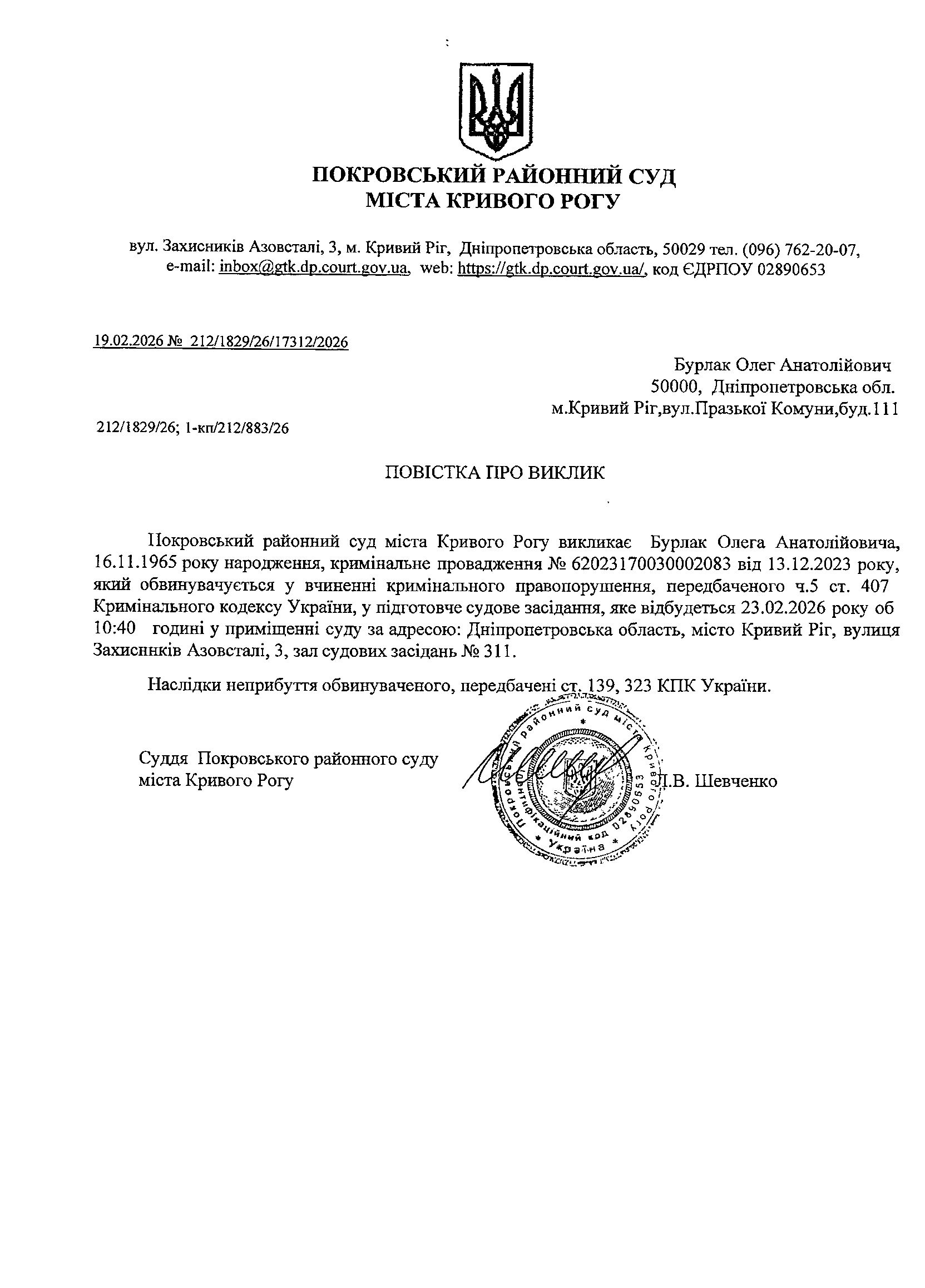 Оголошення про виклик до суду Бурлака Олега Анатолійовича