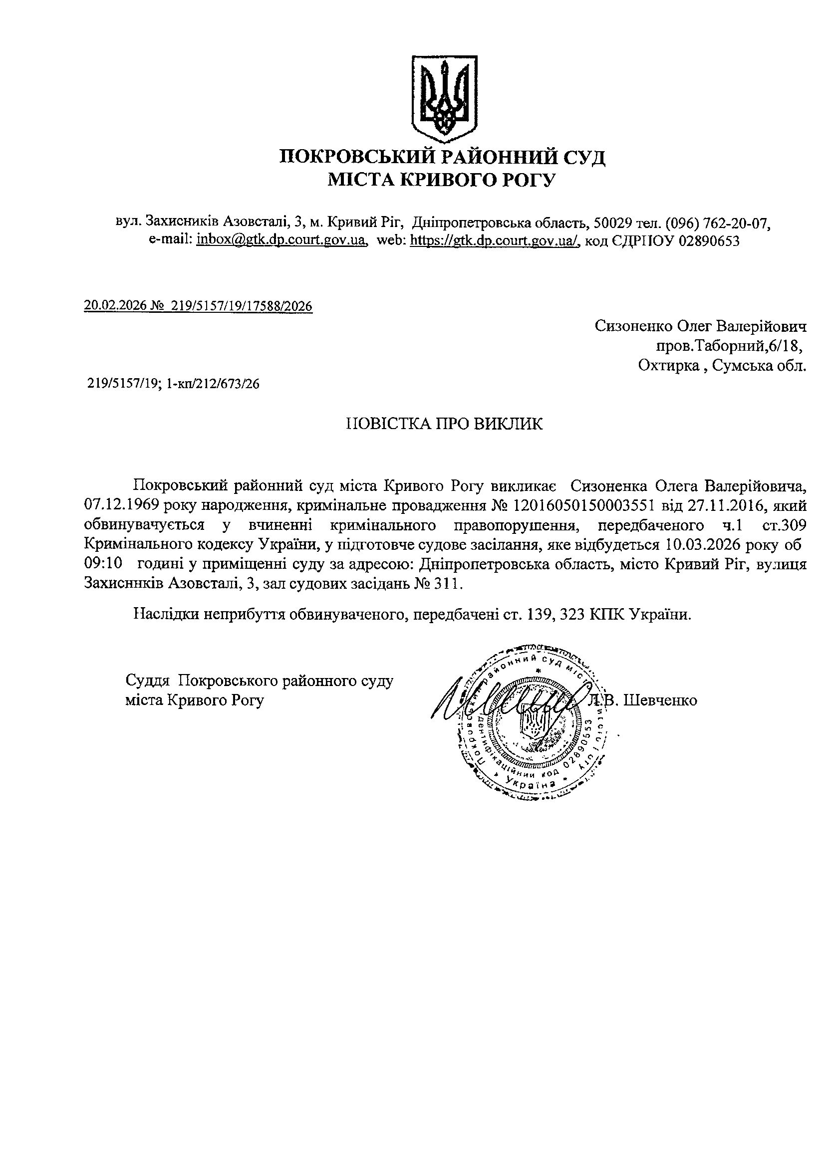 Оголошення про виклик до суду Сизоненка Олега Валерійовича