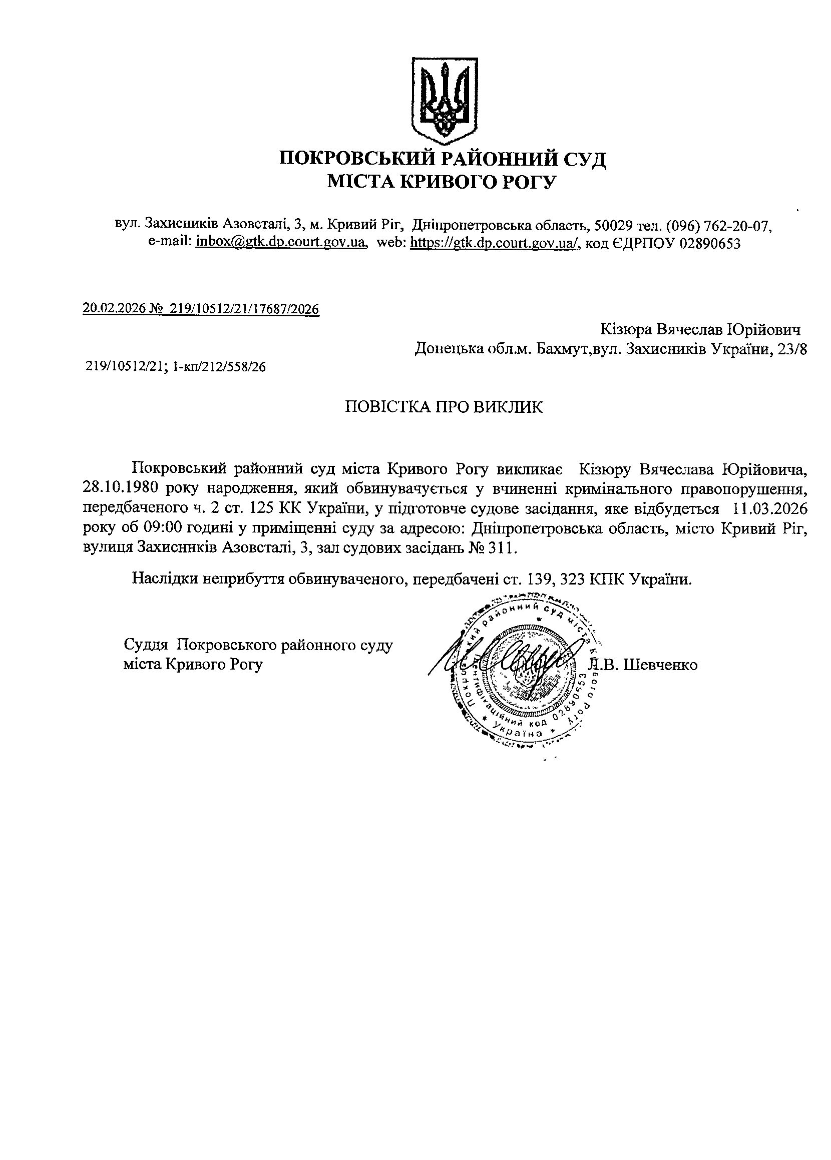 Оголошення про виклик до суду Кізюри Вячеслава Юрійовича