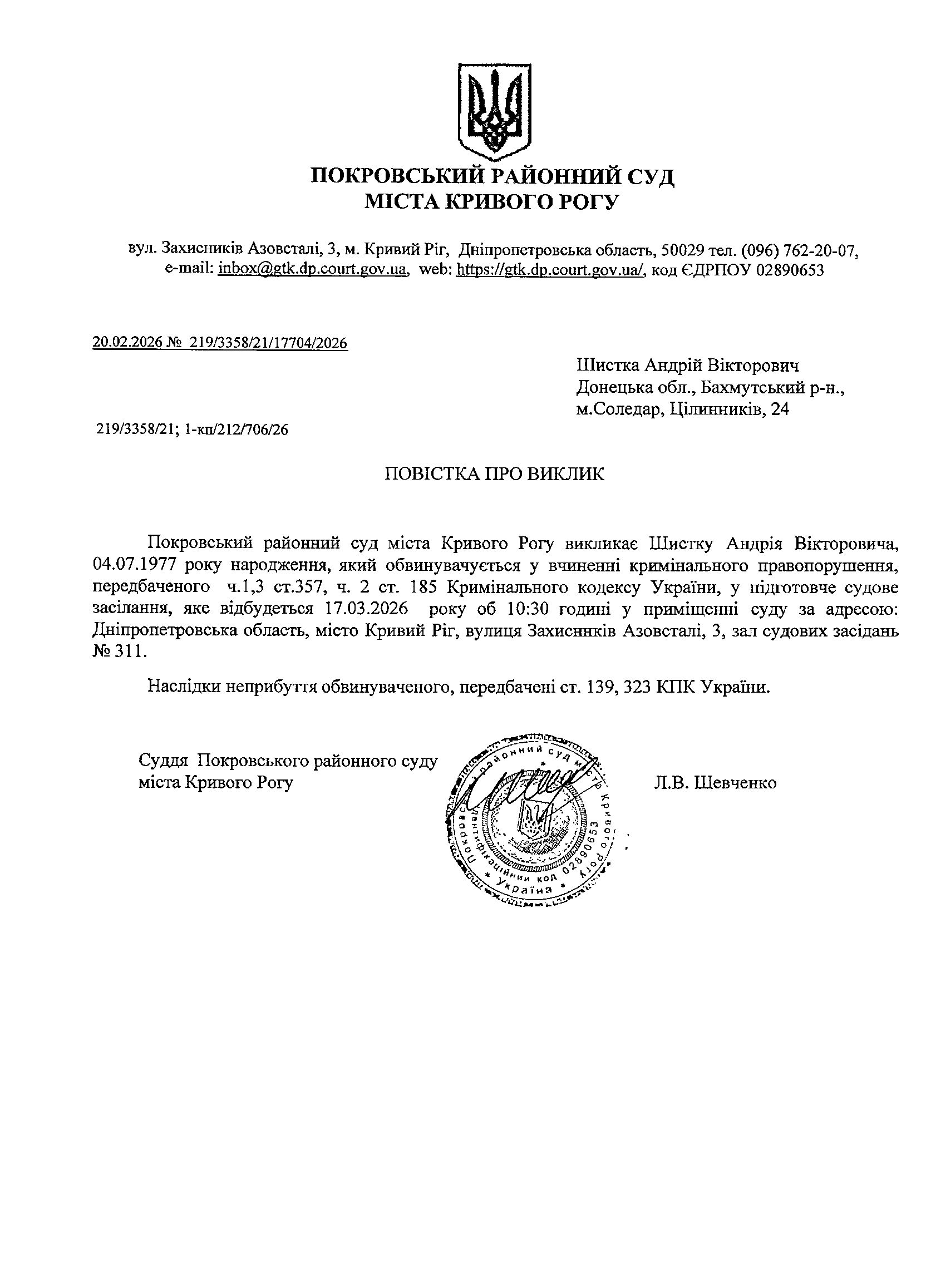 Оголошення про виклик до суду Шистки Андрія Вікторовича