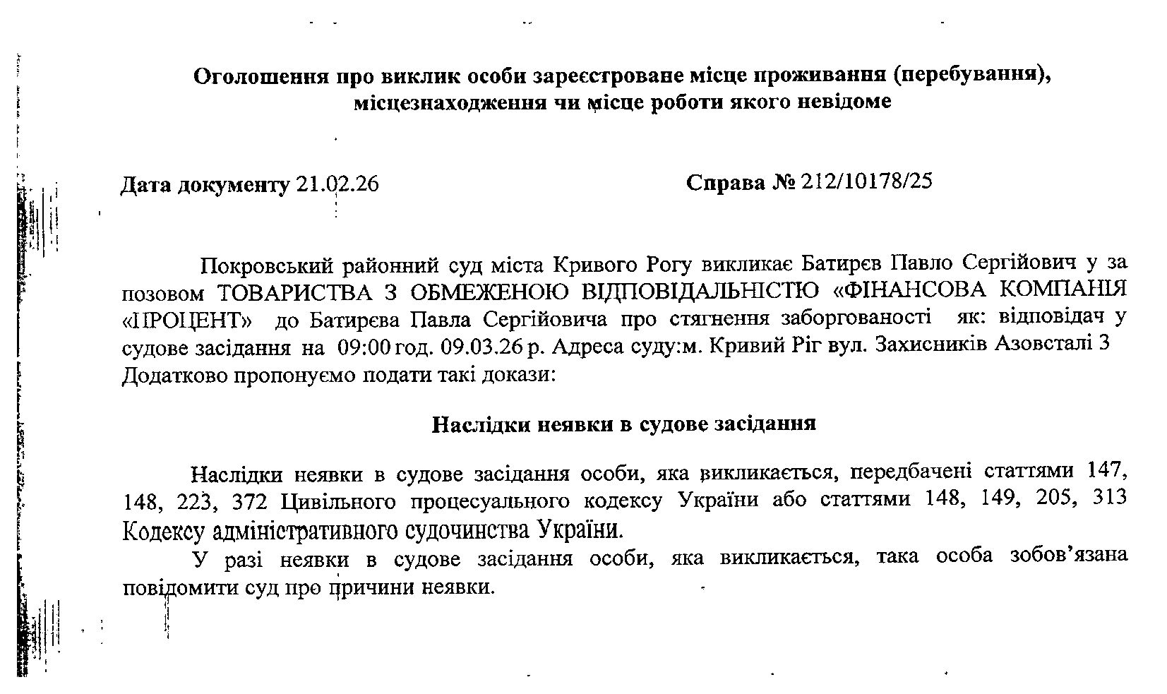 Оголошення про виклик до суду Батирєва Павла Сергійовича