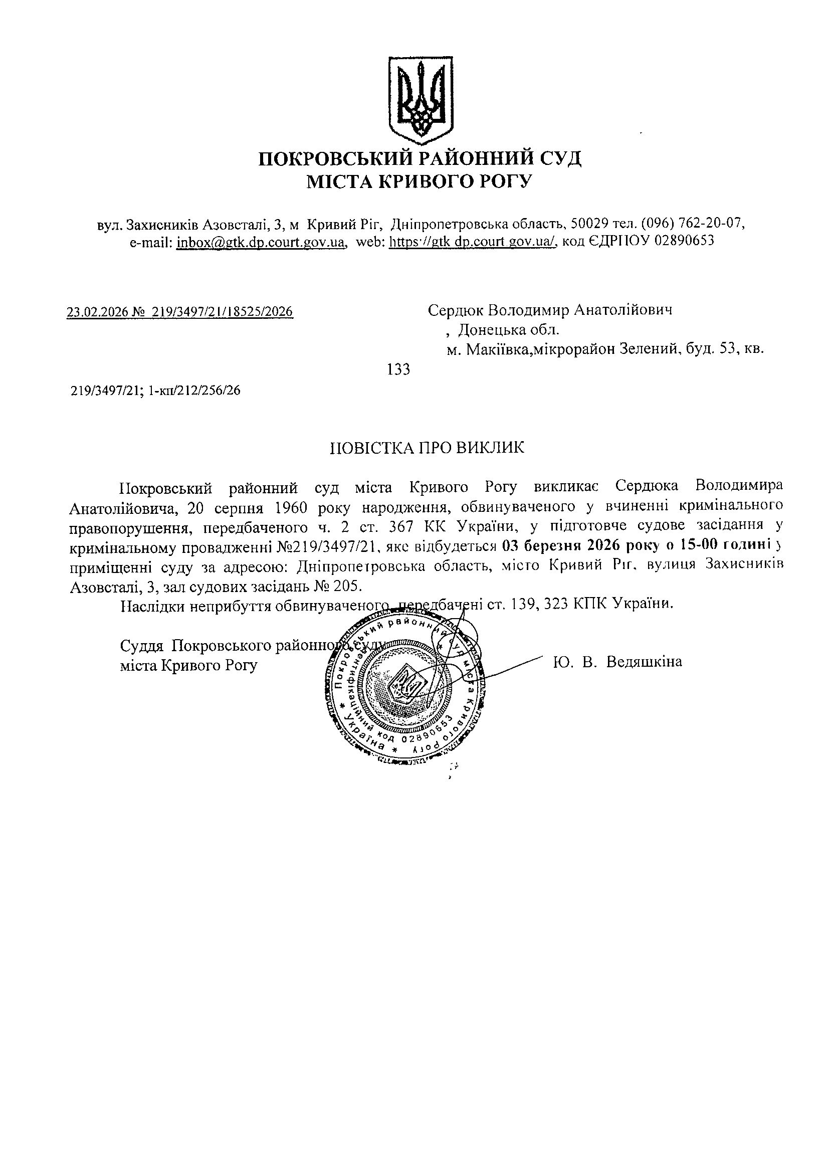 Оголошення про виклик до суду Сердюка Володимира Анатолійовича