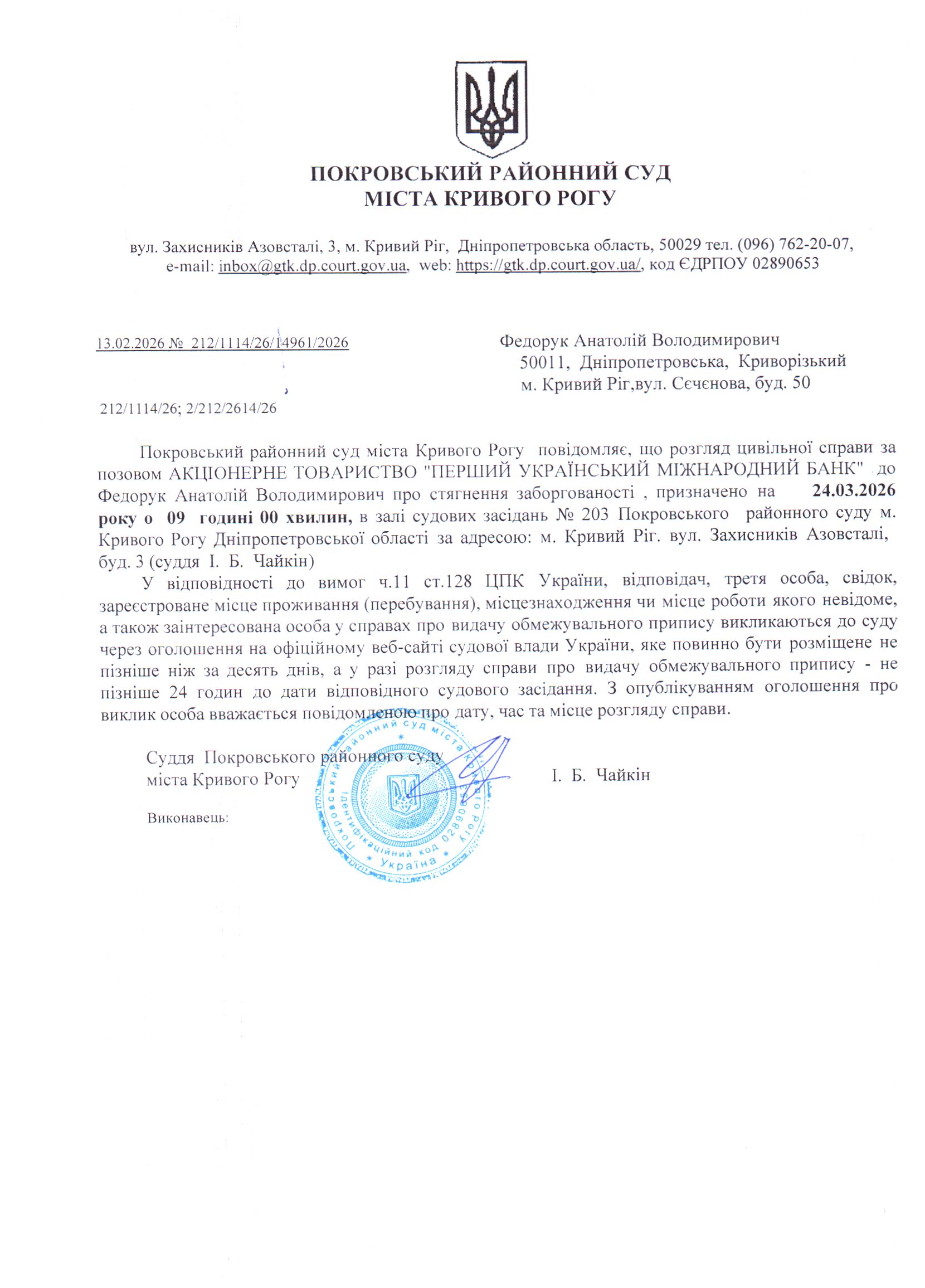 Оголошення про виклик до суду Федорука Анатолія Володимировича