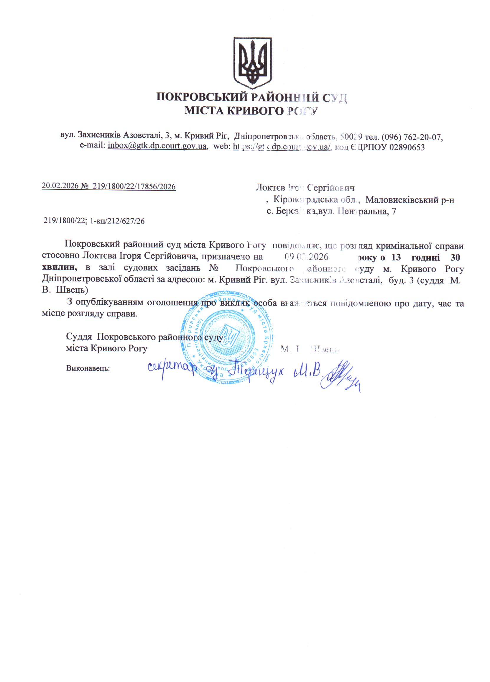Оголошення про виклик до суду Локтєва Ігоря Сергійовича