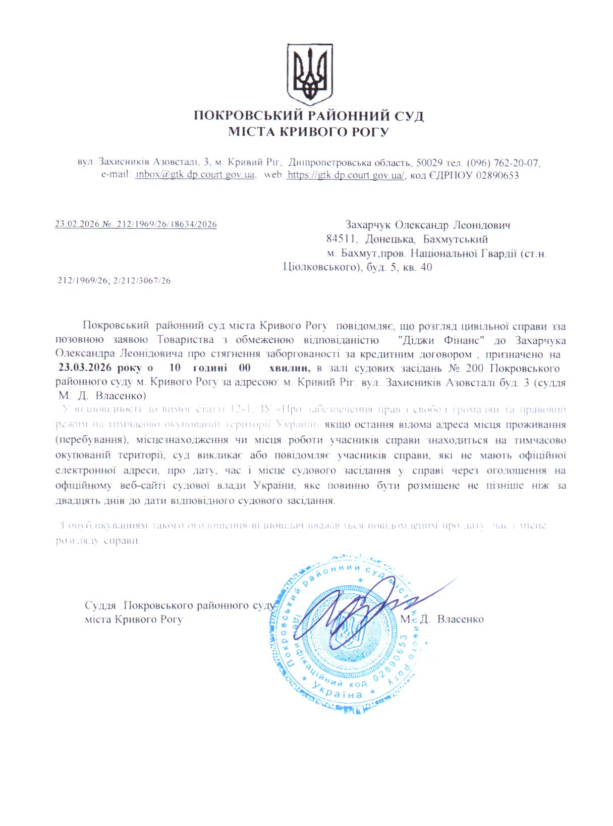 Оголошення про виклик до суду Захарчука Олександра Леонідовича