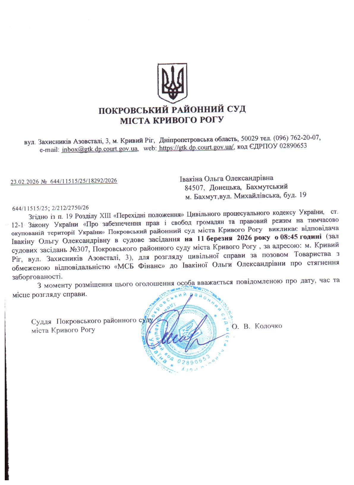 Оголошення про виклик до суду Івакіної Ольги Олександрівни