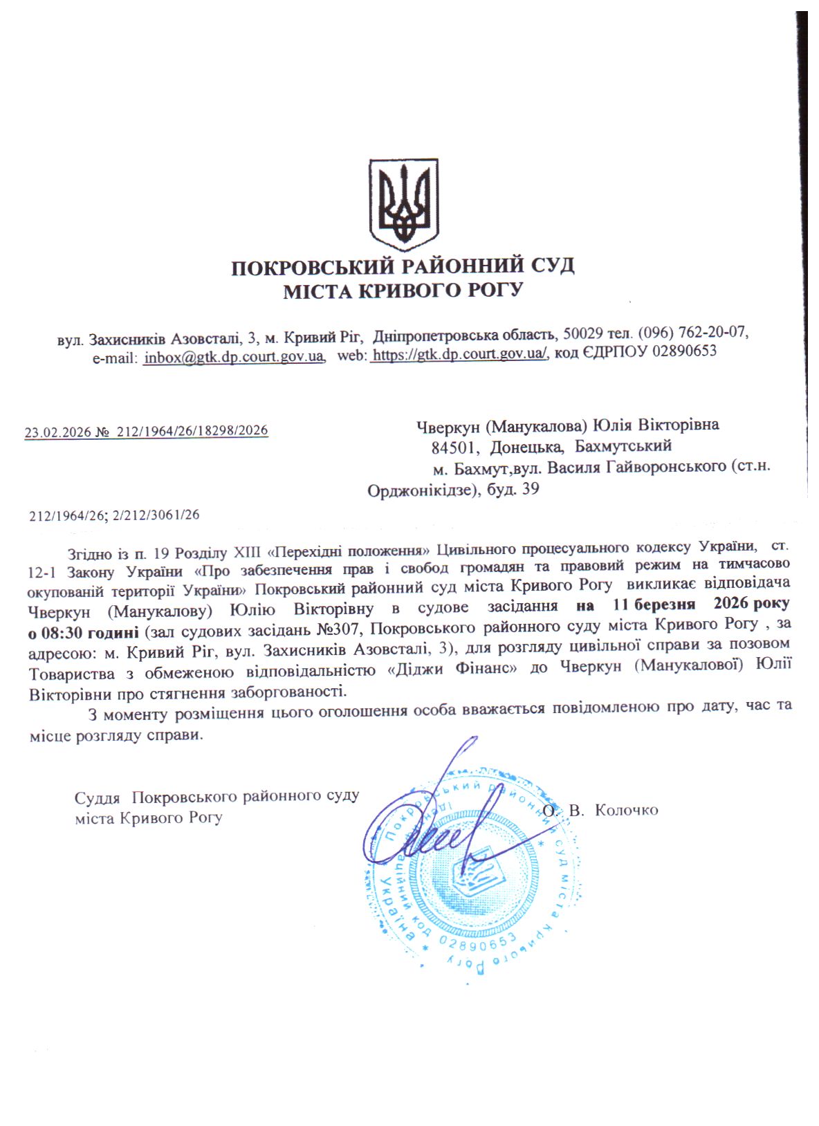 Оголошення про виклик до суду Чвиркун (Манувалову) Юлію Вікторівниу