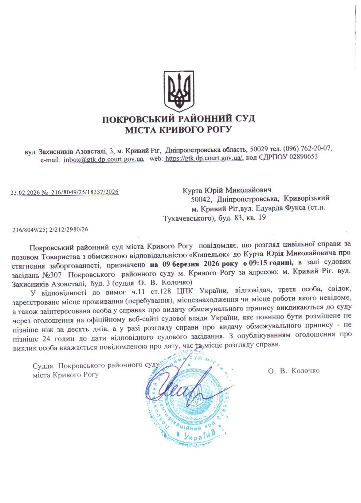 Оголошення про виклик до суду Курта Юрія Миколайовича
