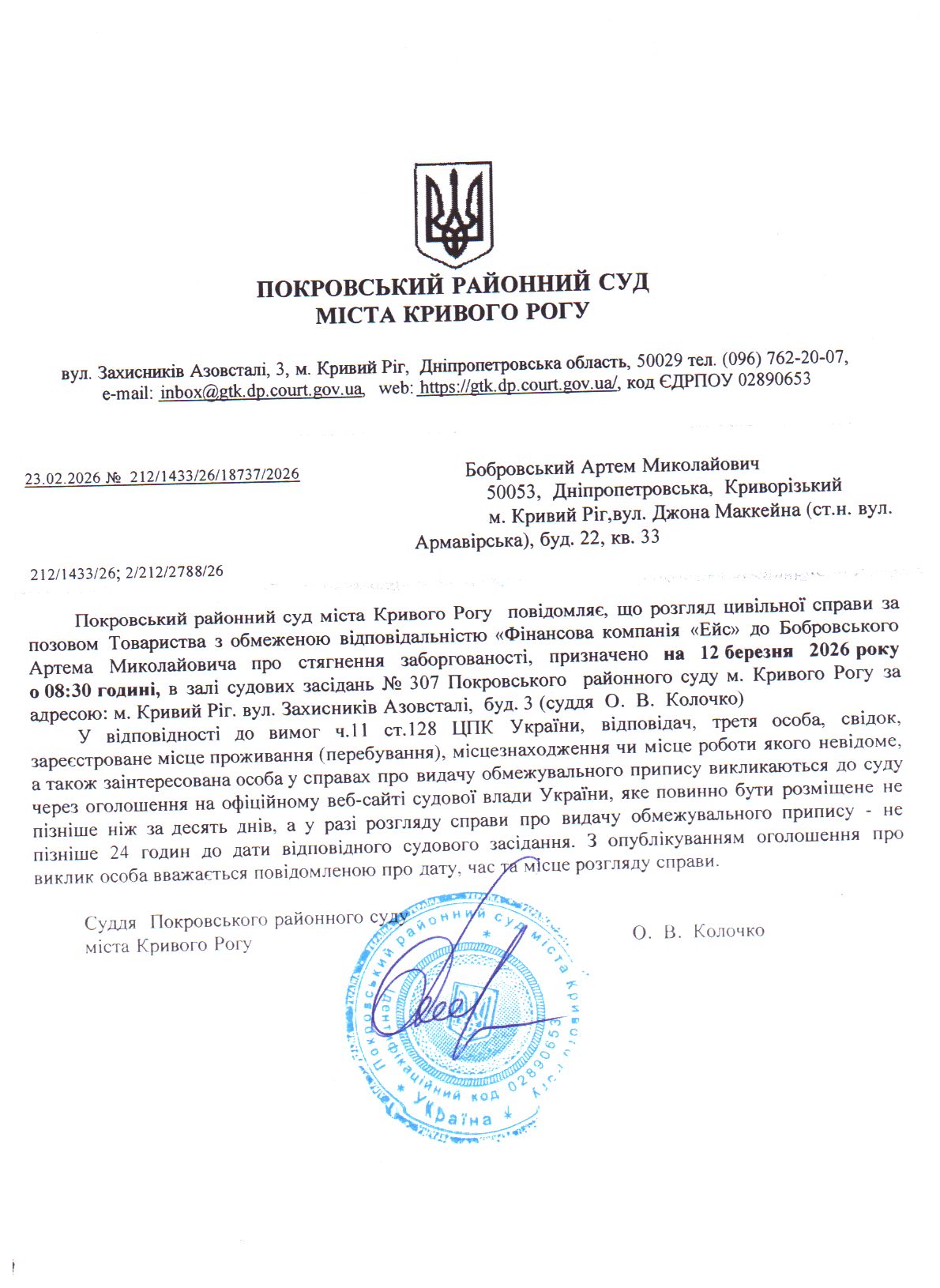 Оголошення про виклик до суду Бобровського Артема Миколайовича