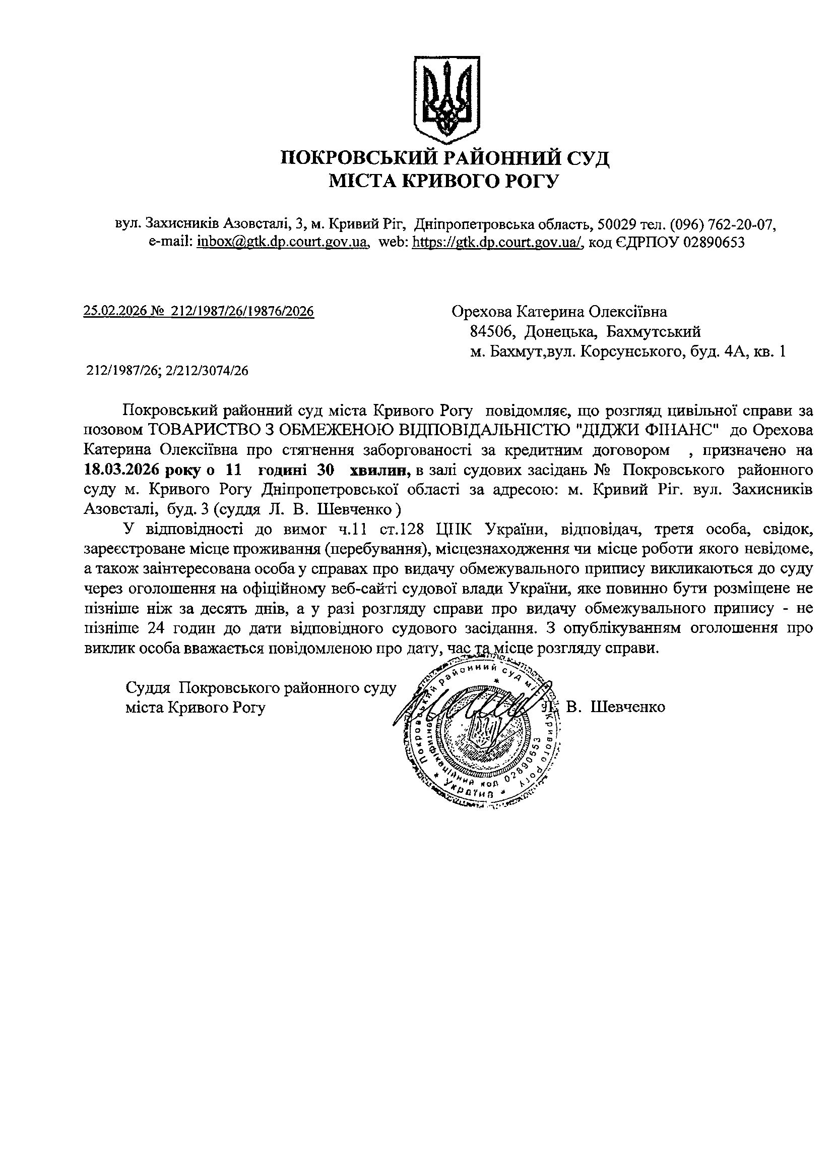 Оголошення про виклик до суду Орехової Катерини Олексіївни
